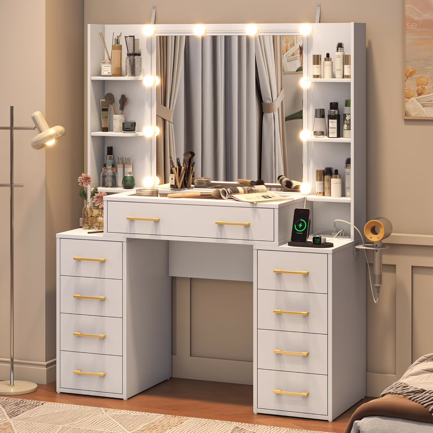 White Vanity Desk with Mirror & LED Lights, Glass Top Vanity Desk with Charging Station & Compartment Storage Drawers, 43" Large Makeup Vanity Table with 9 Drawers & 6 Shelves