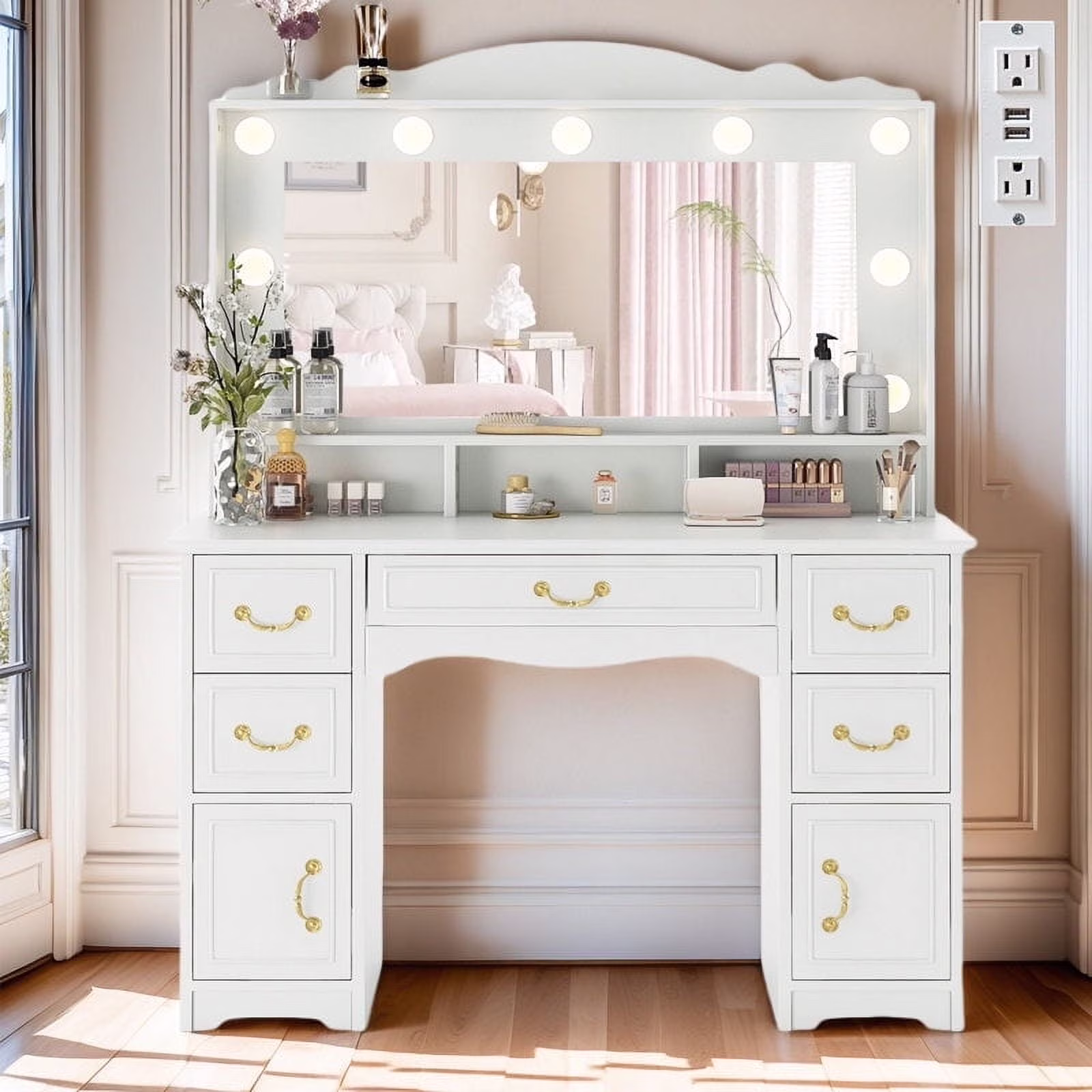 Vanity Desk with Mirror and Light 1 Piece Bohemian White Vanity Table,French Country Style