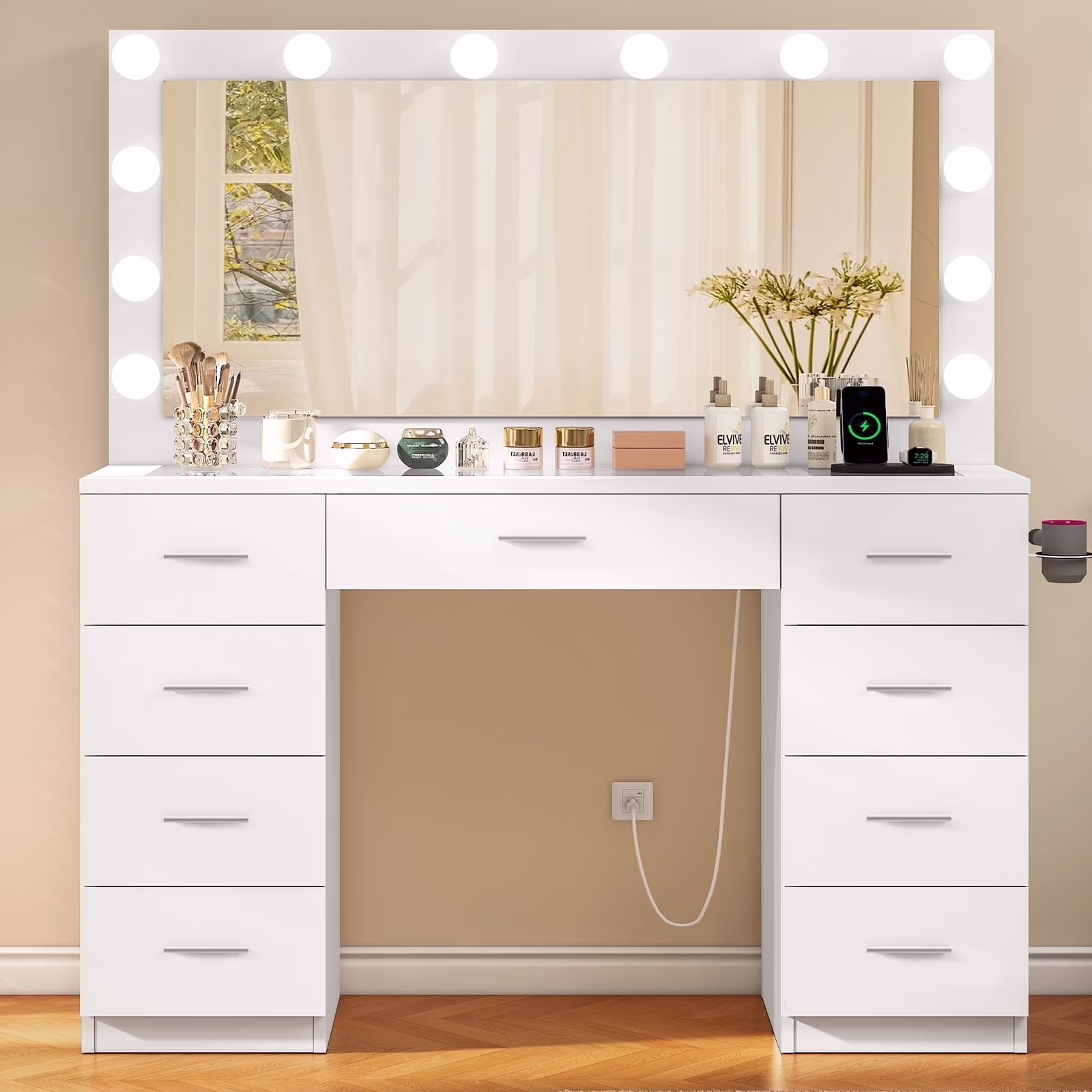 TEENFON 46" Vanity Desk with Large Lighted Mirror and Power Outlet, Makeup Vanity with 9 Drawers and Glass Desktop, Vanity Table for Bedroom, White
