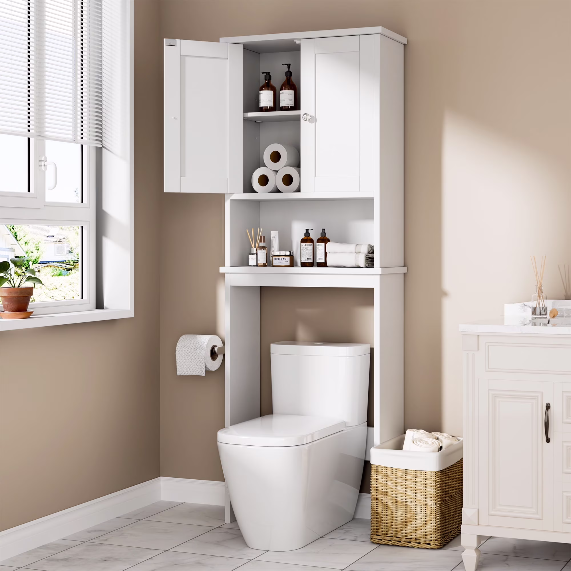 Walsunny Over The Toilet Storage Cabinet Bathroom Shelves Organizer Space Saver Freestanding Restroom Shelf with Doors Anti-Tip Device Adjustable Shelf White