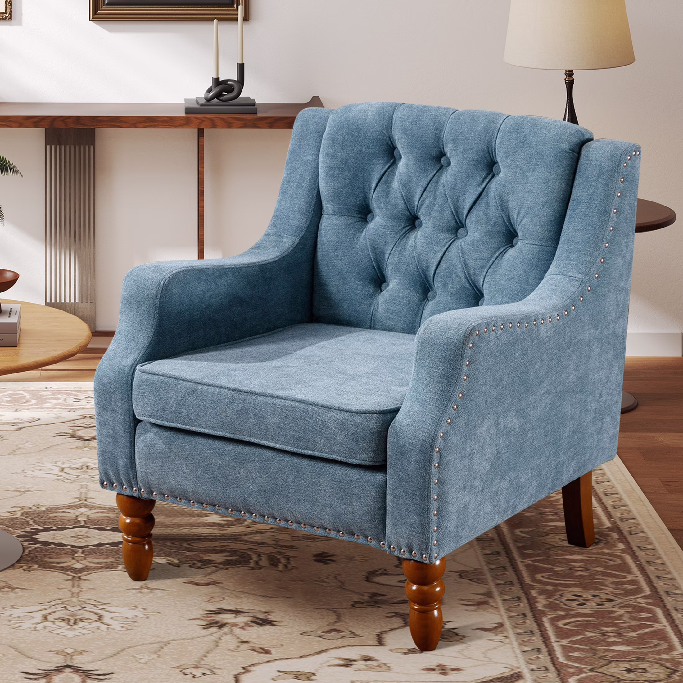 SYNGAR Accent Chair, Mid-Century Linen Accent Armchair with Vintage Brass Studs, Solid Wood Legs, Button Tufted Upholstered, Comfy Reading Chair for Living Room and Bedroom, Reception Room, Blue