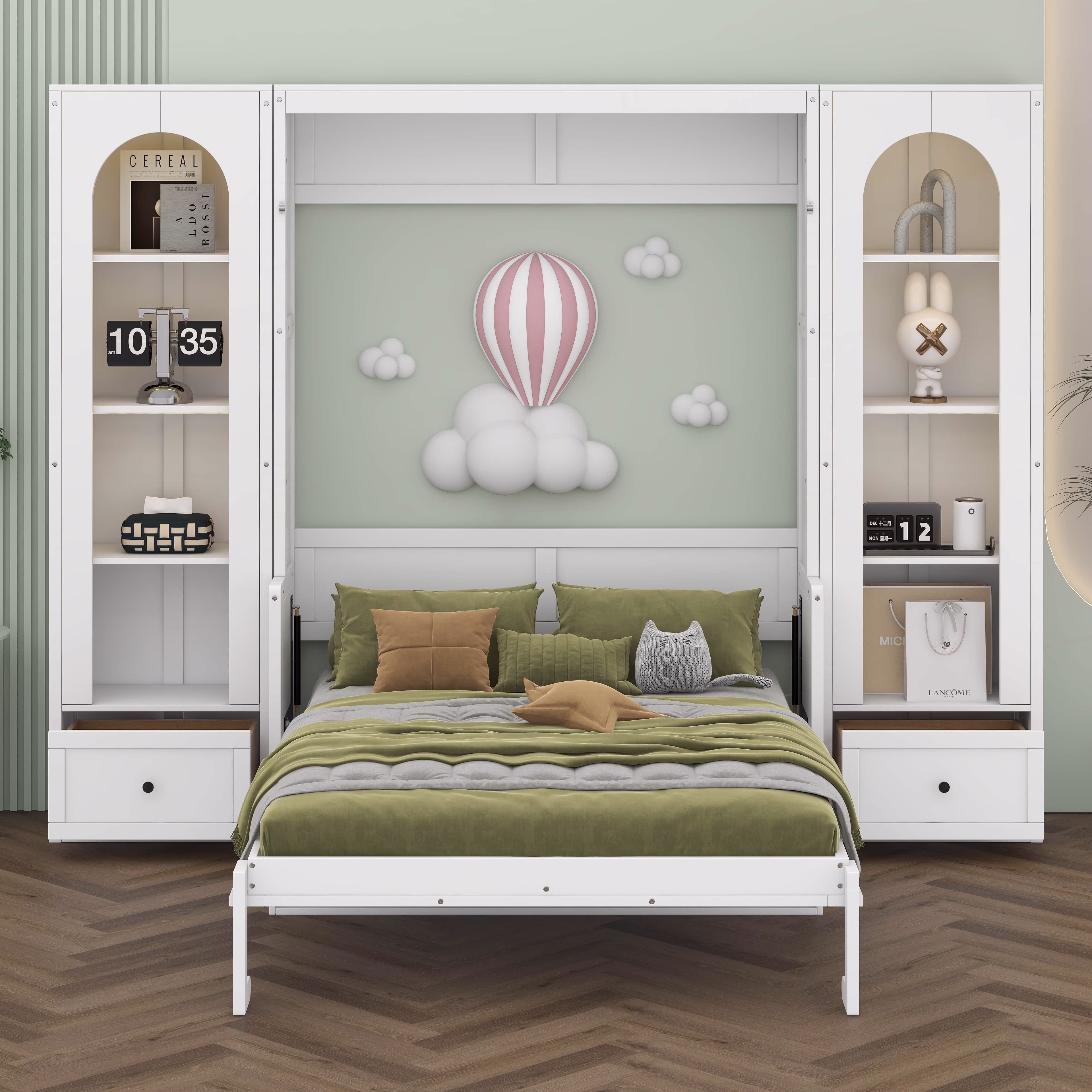 BEBPILOO Queen Size Murphy Platform Bed with Side Cabinets, Drawers and LED Light Strips, White