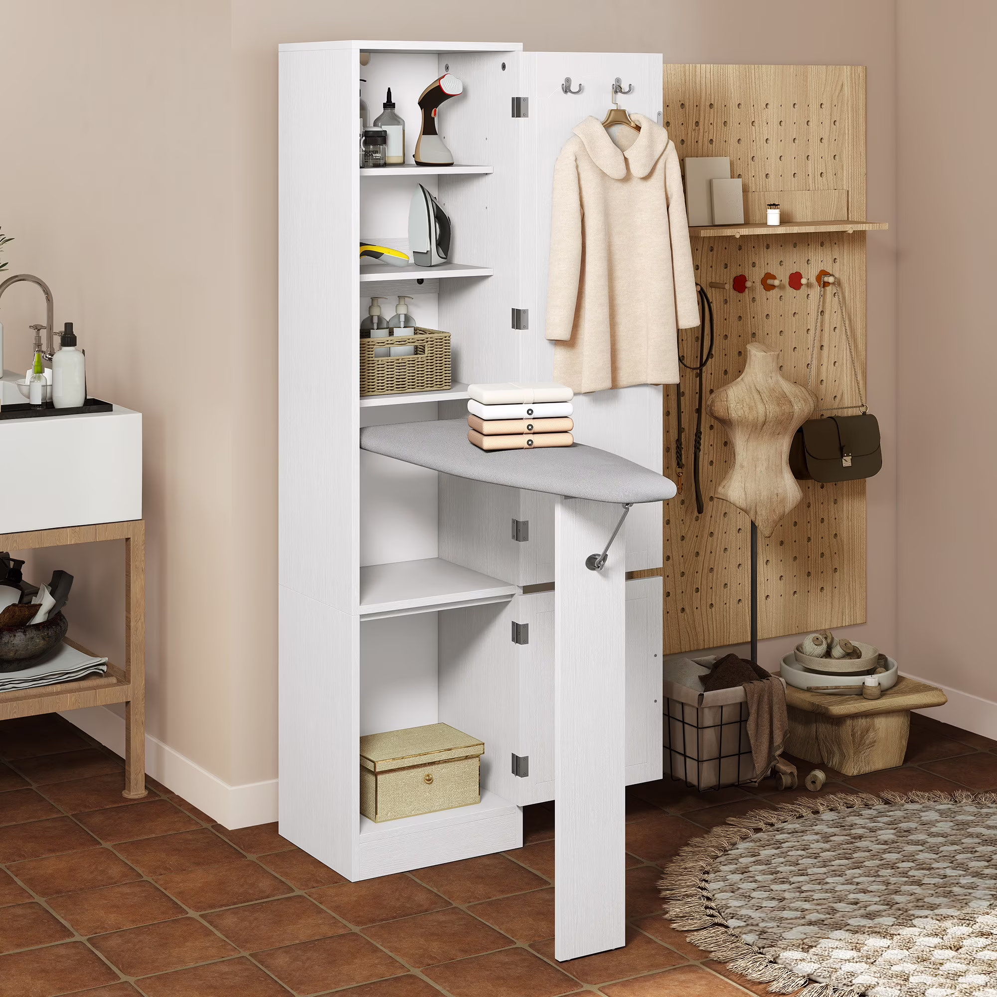Uforic Ironing Board with Storage Cabinet, Ironing Board Cabinet, Foldable Ironing Board with Support Leg, White