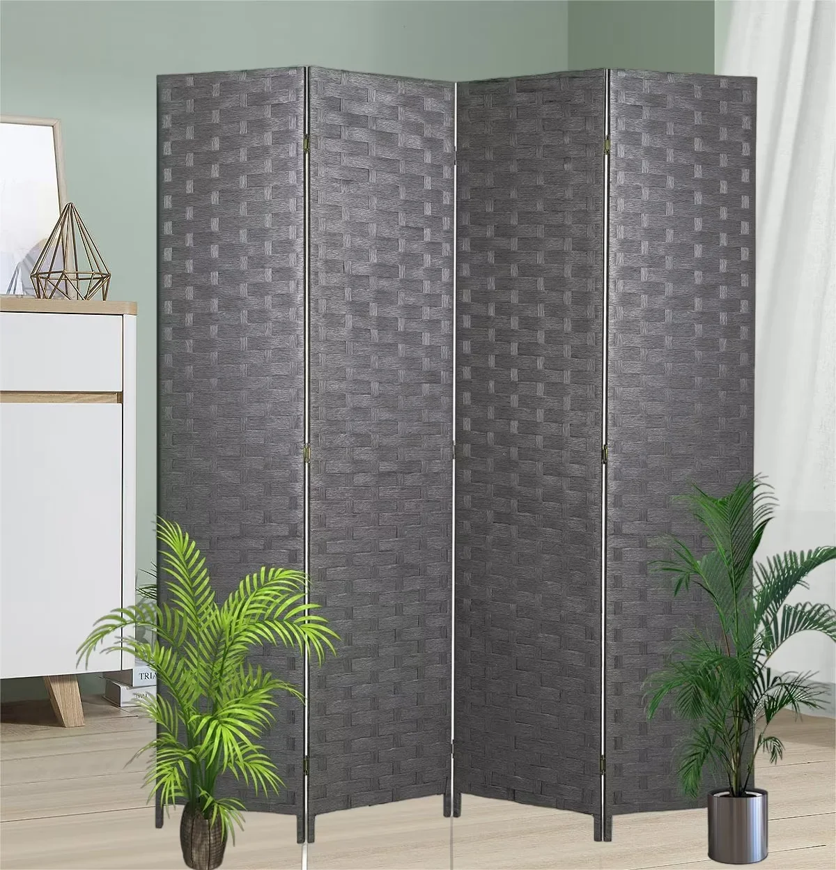 XF XINFENG 4-Panel Foldable Wooden Woven Room Divider, Home/Office, 6 ft, Gray