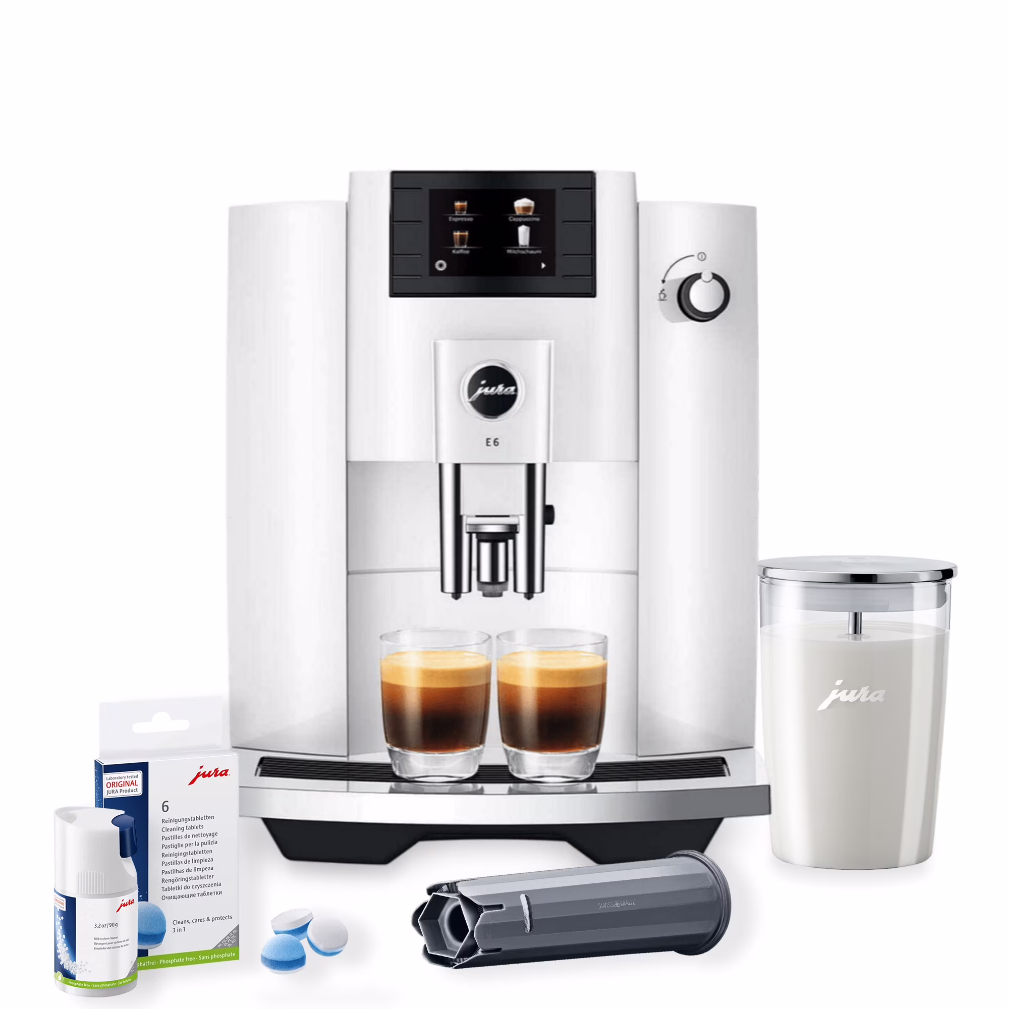 Jura E4 Coffee Machine (Piano White) with Filter, Cleaning Tablets and Coffee