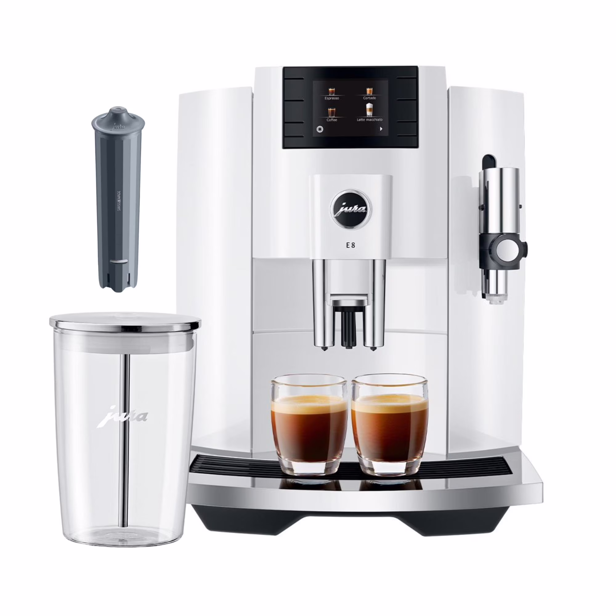 Jura E8 Automatic Espresso Machine (White) with Smart Filter Cartridge, and Glass Milk Container