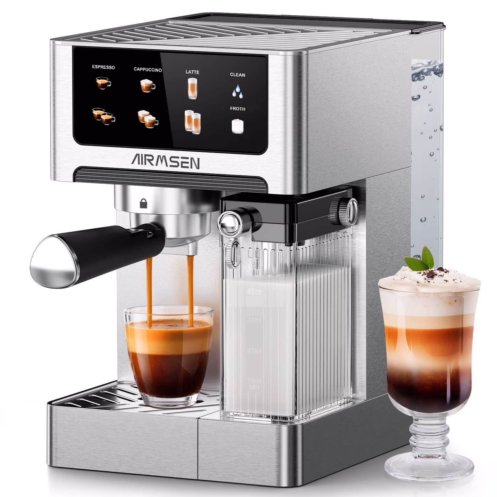 AIRMSEN Espresso Machine with Color Touchscreen, 20 Bar Cappuccino Latte Machines with Automatic Milk Frother, Dual Boiler Stainless Steel Espresso Maker for Home, 1350W
