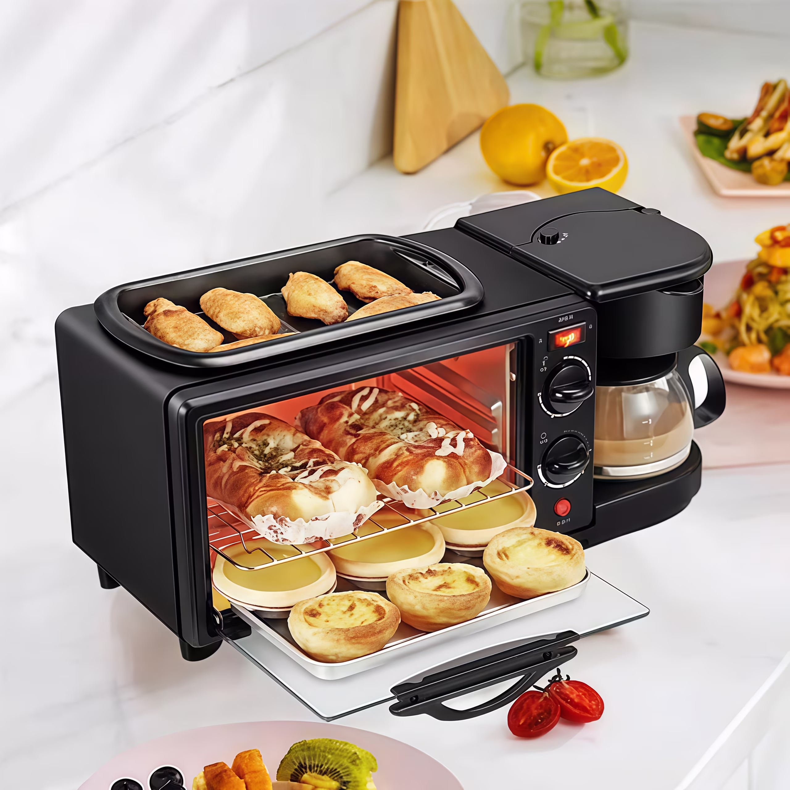 3-in-1 Commercial Breakfast Station: Oven, Coffee Maker & Griddle for Sandwiches, Pancakes & Pastries, Compact Stainless Steel Countertop Appliance for Home, Office & Restaurant Use (120V)