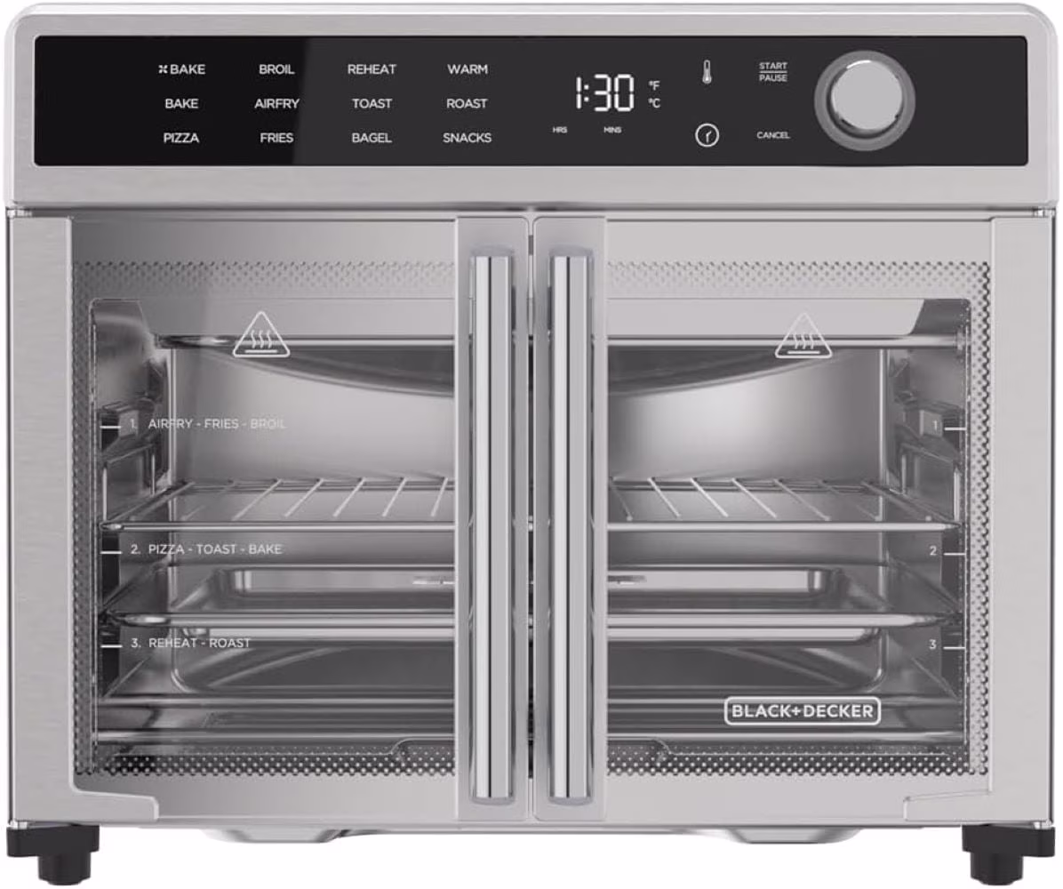 BLACK+DECKER Crisp 'N Bake Air Fryer Toaster Oven Combo, 12 in 1 Countertop Convection Oven Cooks Food Fast, Fits a Whole Pizza or 6 Toast Slices, French Doors with Stainless Steel Finish