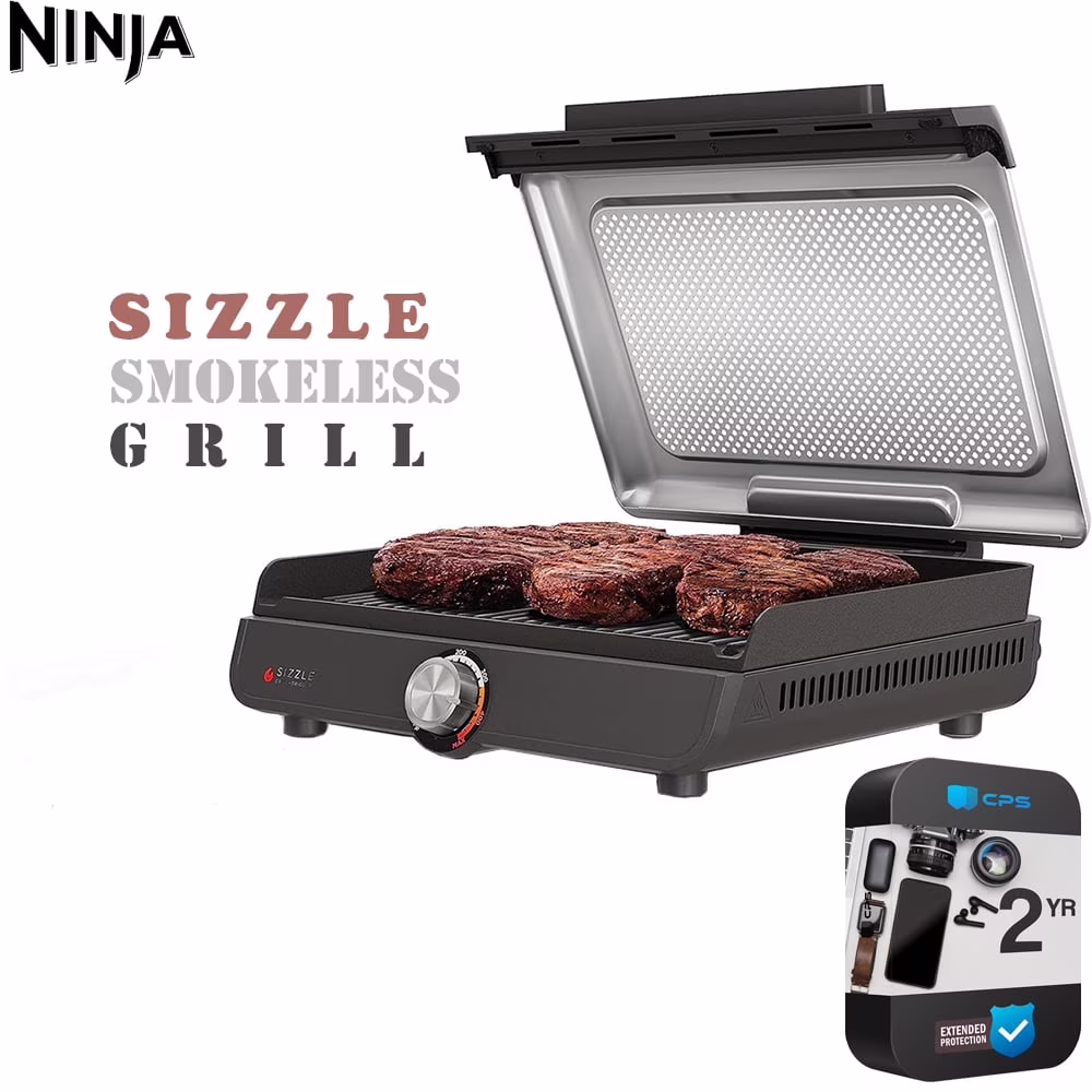 Restored Ninja GR100 Sizzle Smokeless Indoor GrillBundle with 2 Year Enhanced Protection Pack (Refurbished)