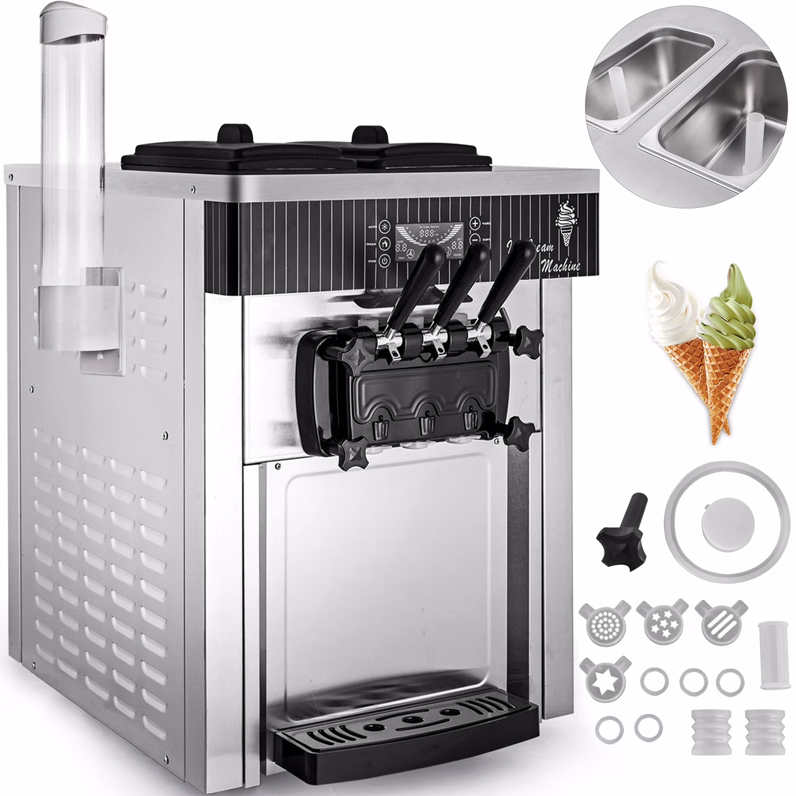 VEVOR Commercial Ice Cream Machine 20-28L/H Soft Serve with LED Display Auto Clean 3 Flavors 2200W,Silver