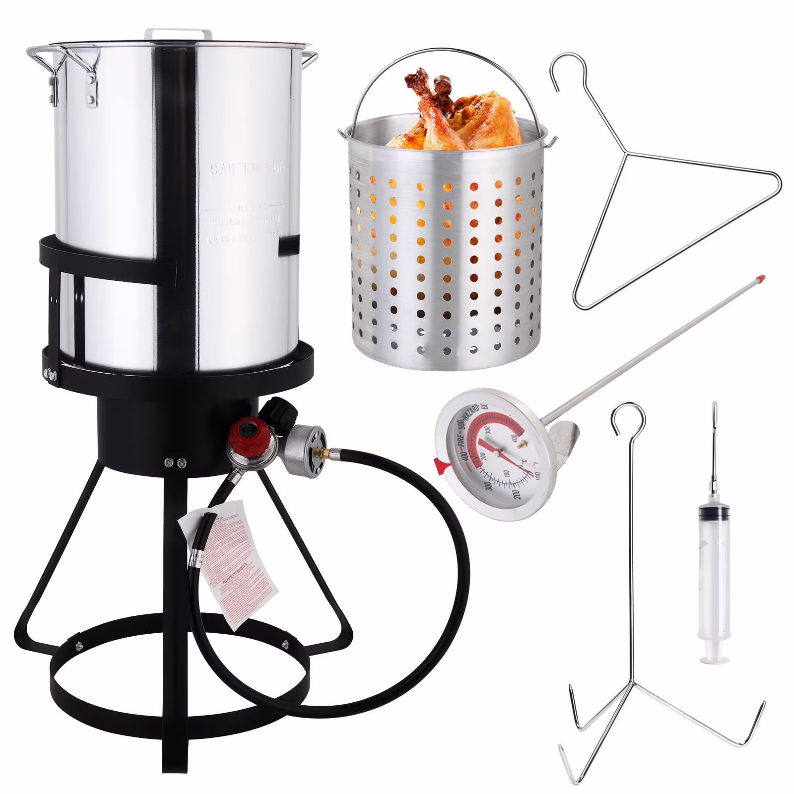 2024 New 30 Qt Turkey & 10 Qt Fish Fryer Boiler Steamer Set, Aluminum Turkey Deep Fryer Pot, 38, 000 BTU Outdoor Propane Stove Stand for 20 Lbs Turkey, Thermometer, Turkey Rack & Lifting Hook