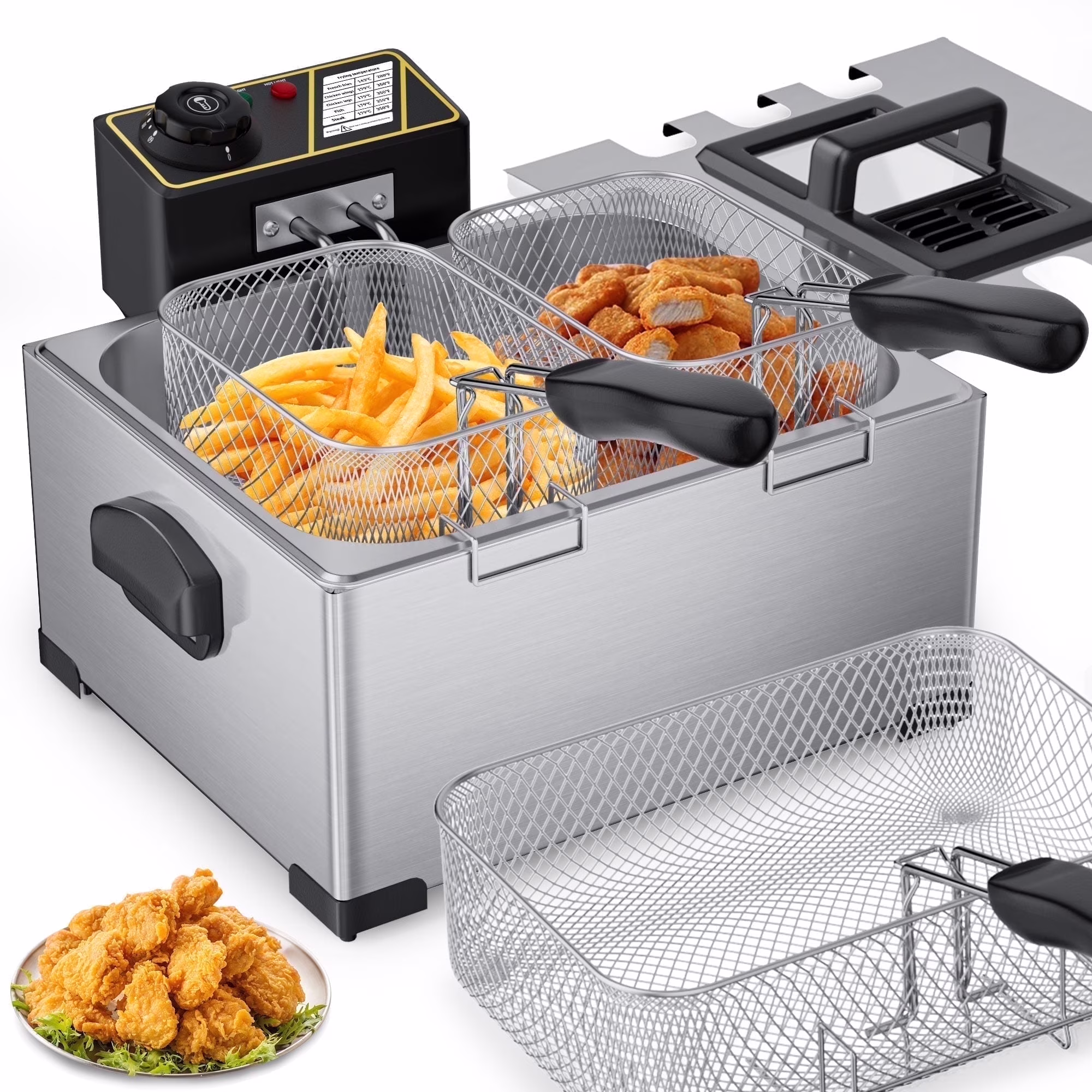 TINANA Large Electric Deep Fryer with 3 Frying Baskets for Home Use, 5.3 Qt / 21 Cups Oil Fryer, Temperature Control, View Window, Professional Style, 2000 W, Stainless Steel