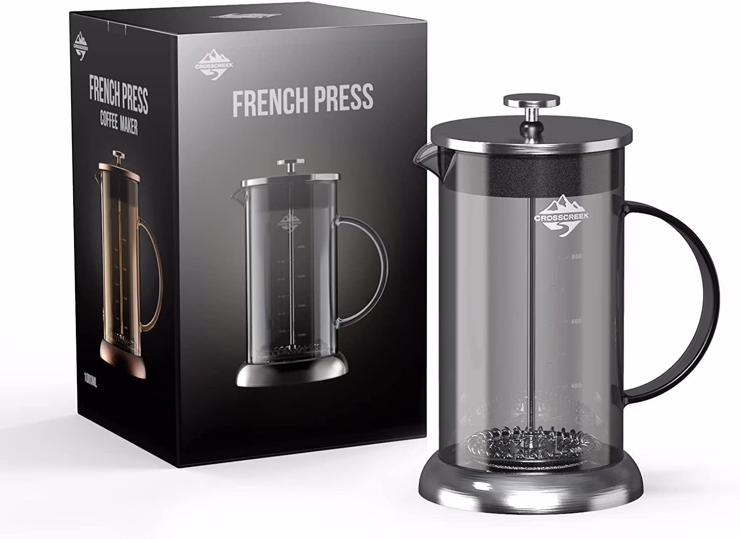 CrossCreek French Press Coffee & Milk Frother, 34oz (4 Cups) Heat Resistant Borosilicate Glass Coffee Press with 4 Filter Screens, Stainless Steel Plunger Durable Easy Clean 100% BPA Free, Cool Grey