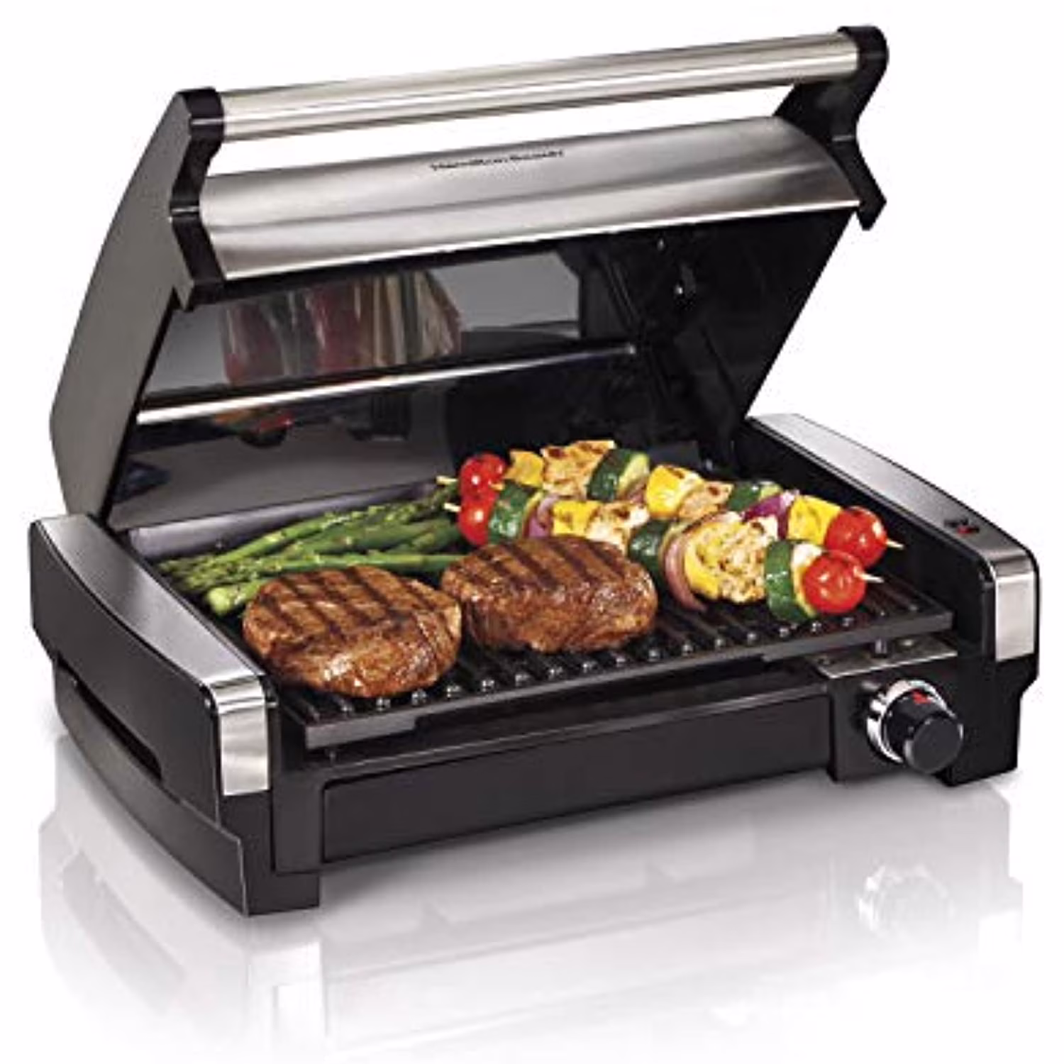 Hamilton Beach Electric Indoor Searing Grill Removable Easy-to-Clean Nonstick Plate, 6-Serving, Extra-Large Drip Tray, Stainless Steel (25360)