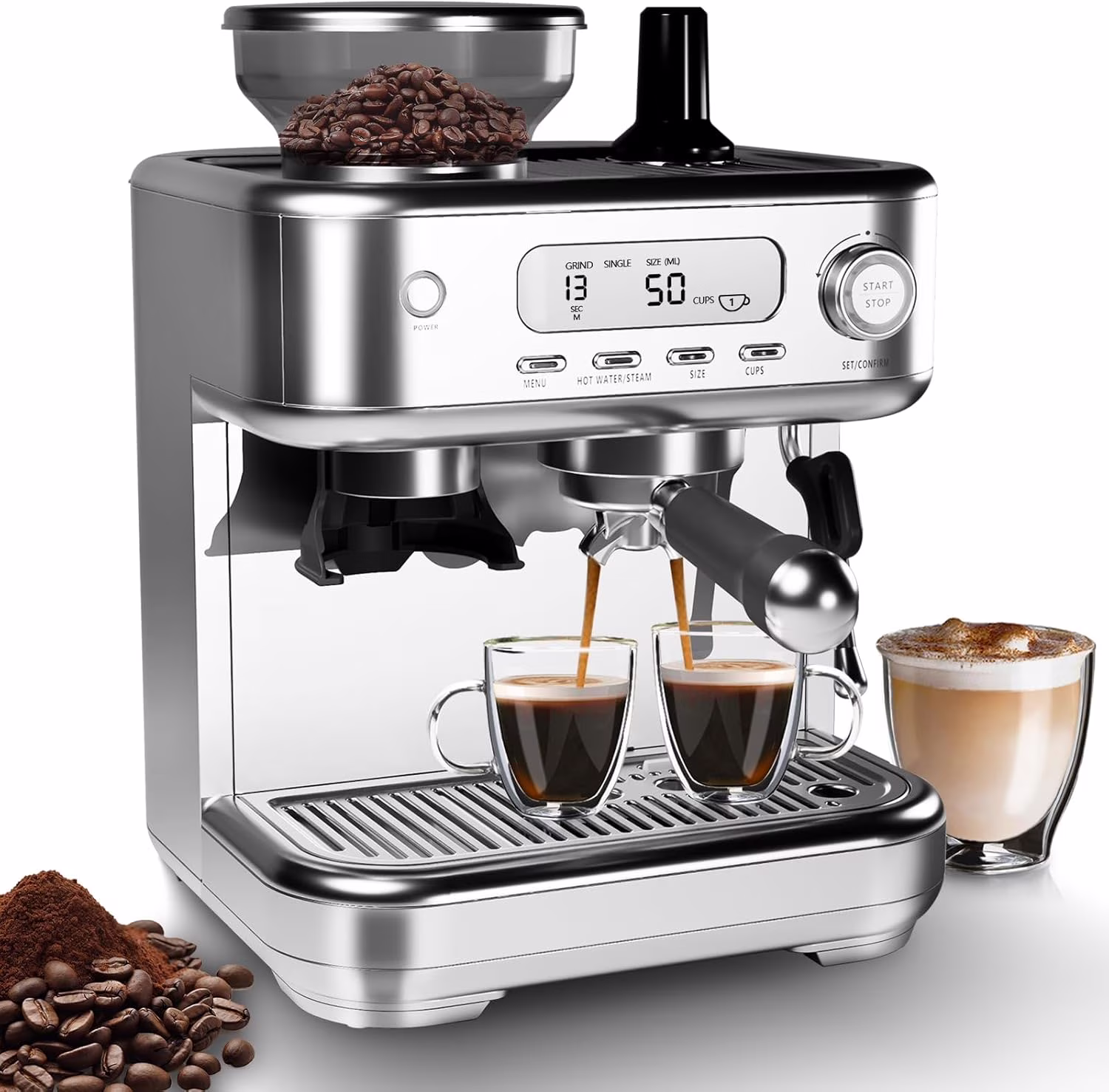 Espresso Machine 15 Bar, LCD Display Espresso Maker with Grinder, Milk Frother and PID Temperature Control, Professional Coffee Maker for Latte Cappuccino - 8.8 Oz Bean Hopper
