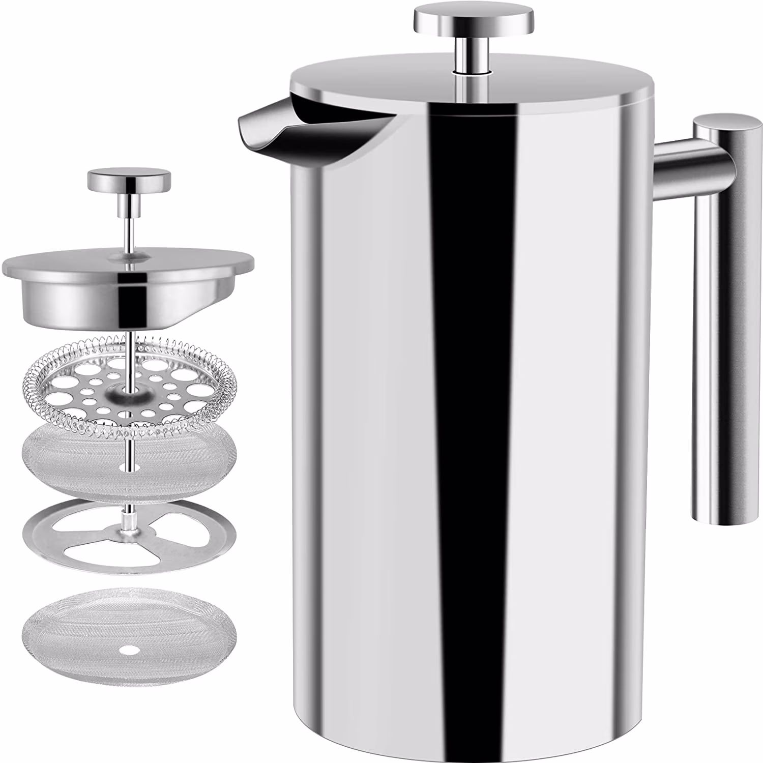 Large French Press Coffee Maker - Double Wall 304 Stainless Steel - 4 Level Filtration System