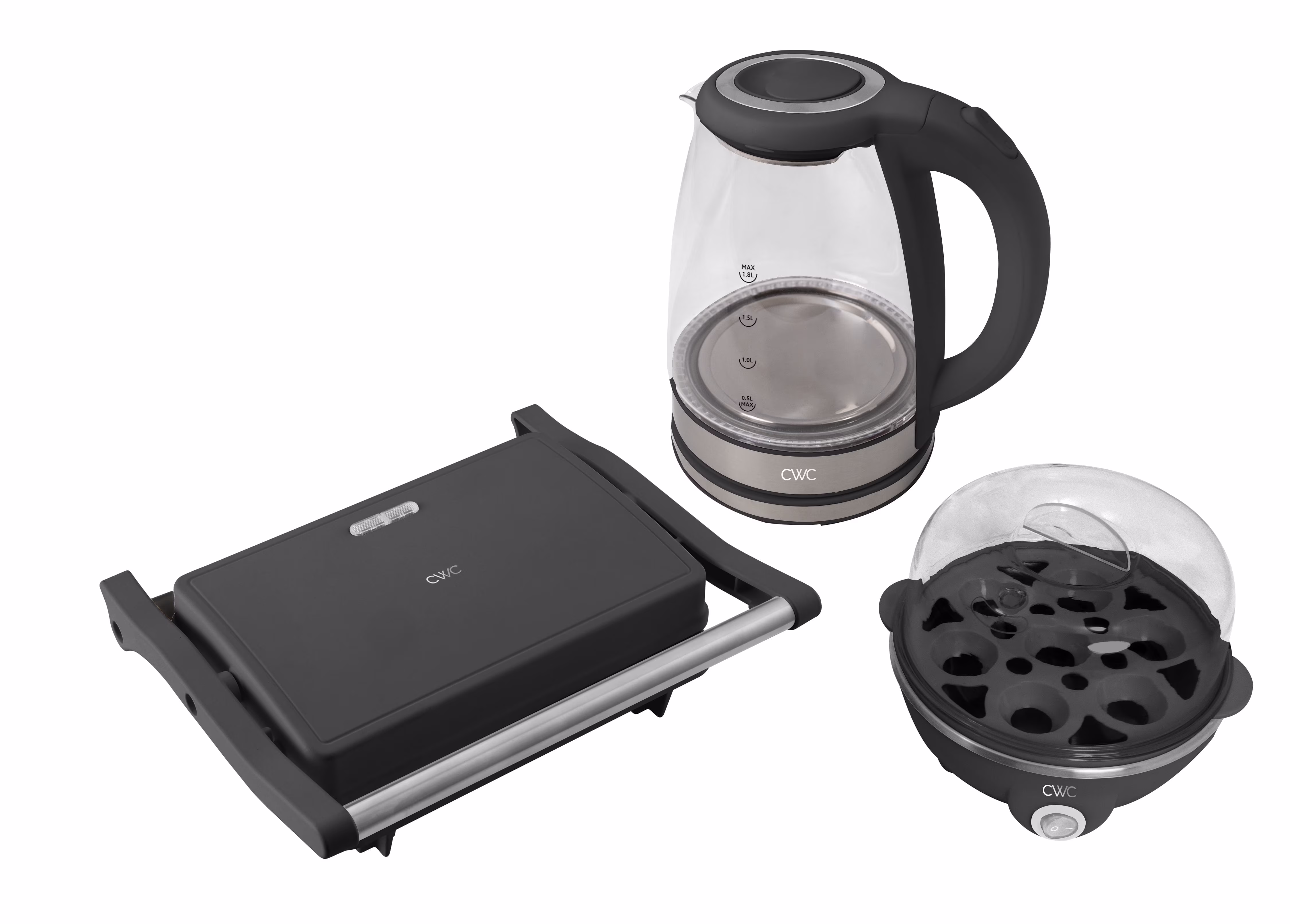 COOK WITH COOKER Compact Egg Boiler, Glass Kettle, & Panini Grill Kitchen Set, 3-piece set, Black