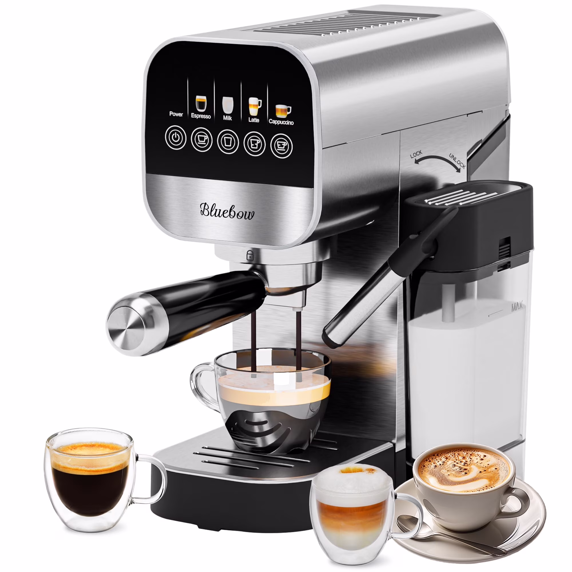 Bluebow Espresso Coffee Machine, 20 Bar Cappuccino & Latte Maker with Auto Milk Frother, Compact Design with Cup Warmer,Stainless Steel