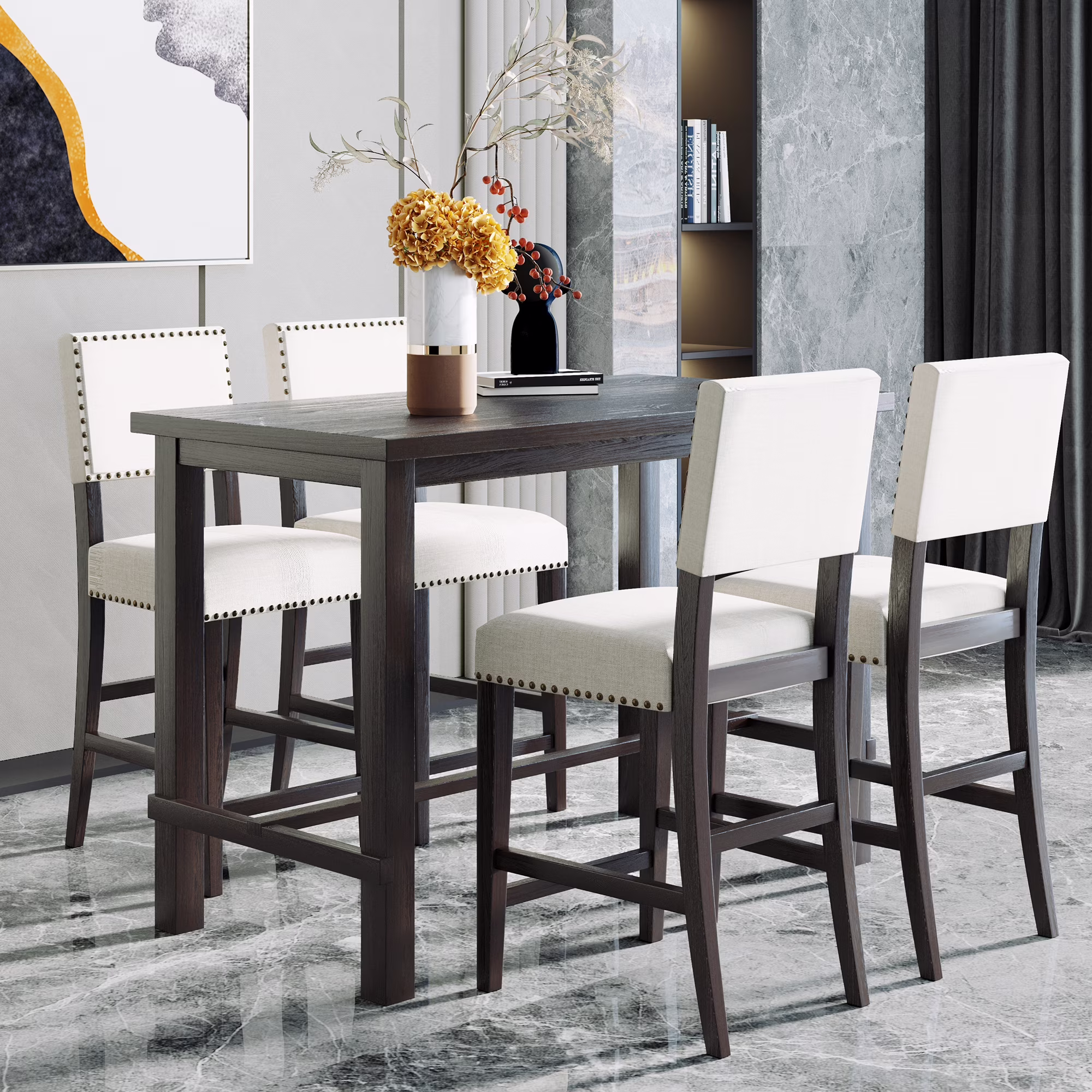 Classic Elegant Kitchen Dining Furniture , Soft Backrest 5-Piece Counter Height Dining Set, Wooden Rectangular Dining Table and 4 Upholstered Chairs Dining Set , Espresso Frame with Beige Cushion