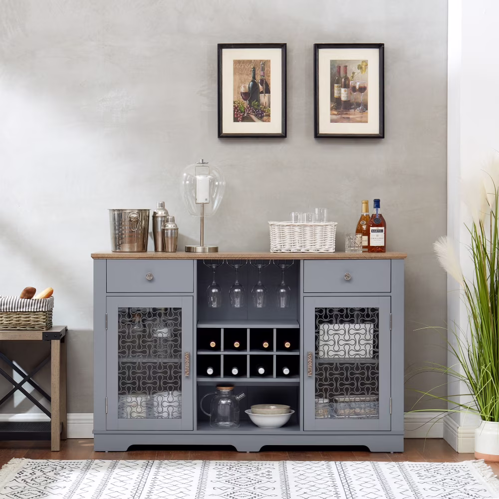Tcbosik Farmhouse Buffet Cabinet, 56.4" Sideboard Cabinet w/2 Drawers and 2 Glass Doors, Coffee Bar Cabinet with Glass Cup Holder and 8-Slot Wine Rack for Dining Room Living Room, Light Blue