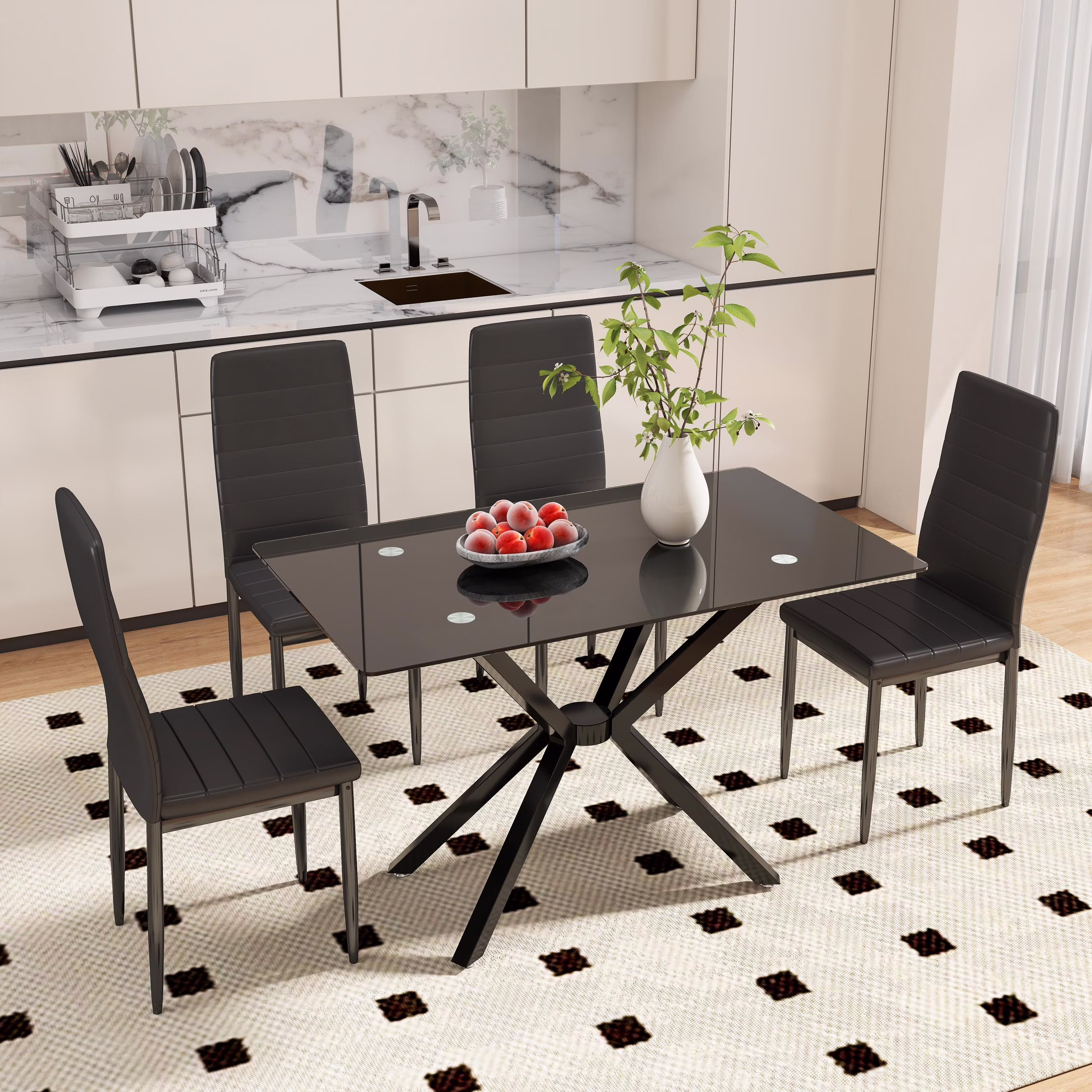 Modern Glass Dinner Table, 8MM Black Tempered Glass Sturdy Table Top, Dining Table Iron Tube Legs w/ Wood Pattern, for Home, Kitchens, Dining Rooms, Cafes, Idea for Eating, Work or Play Games, S12700