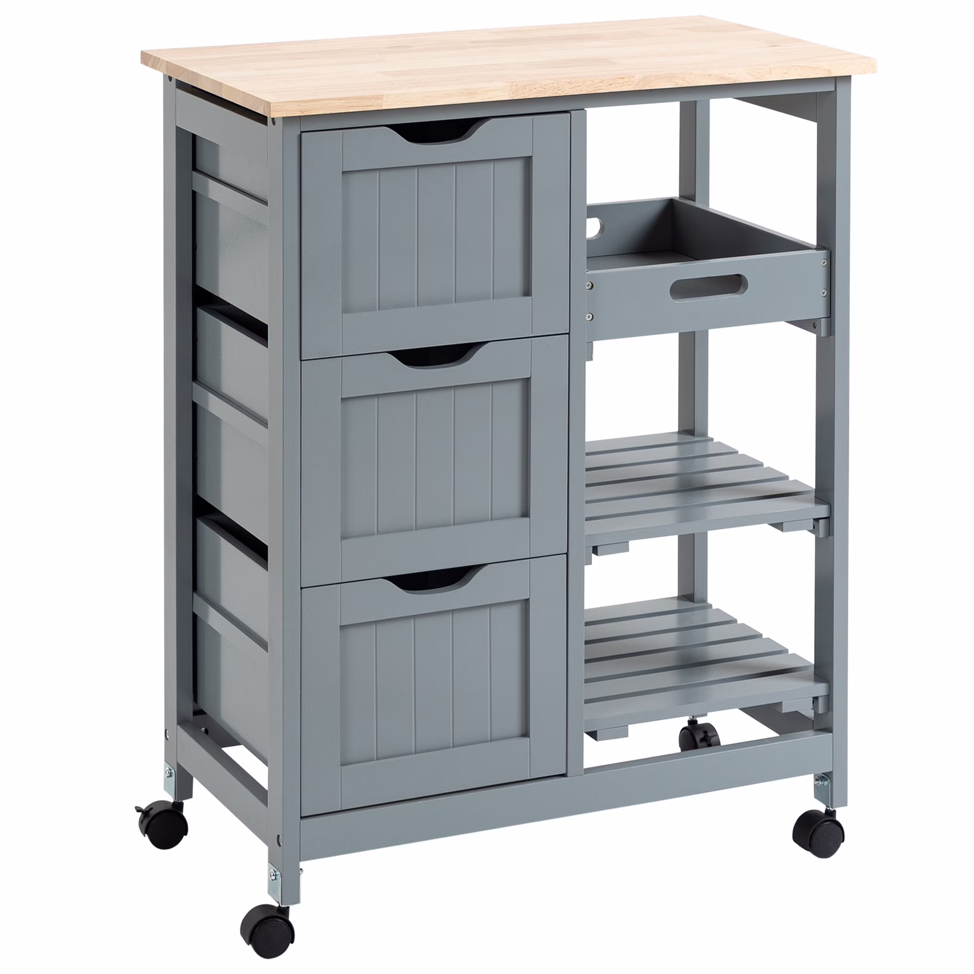 HOMCOM Rolling Kitchen Island Cart, Bar Serving Cart, Compact Trolley on Wheels with Wood Top, Shelves & Drawers for Home Dining Area, Grey