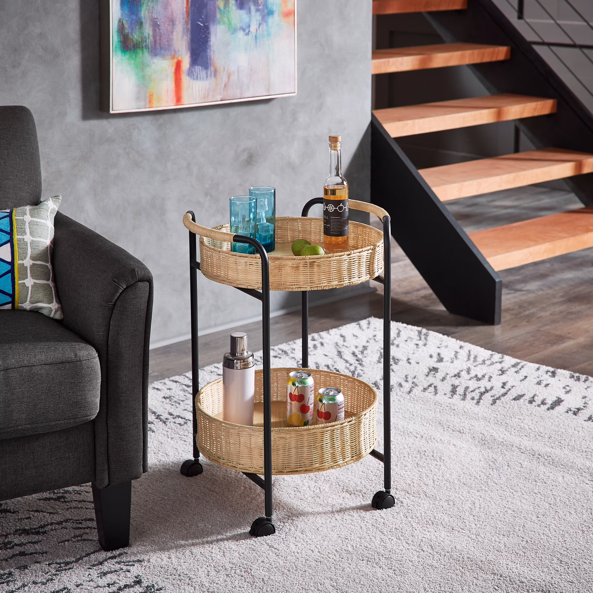 Weston Home Rovinj 18" H 2-Tier Rattan Baskets Serving Cart with Black Metal Frame on Wheels