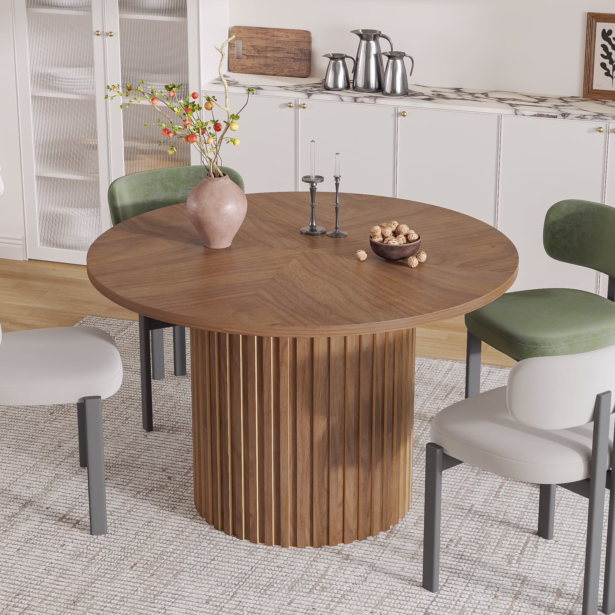 Modern Round Dining Table, 47 Inch Small Circle Kitchen Tables for 4-6, Wood Strip Base, Farmhouse Table for Kitchen, Dinning Room, Walnut