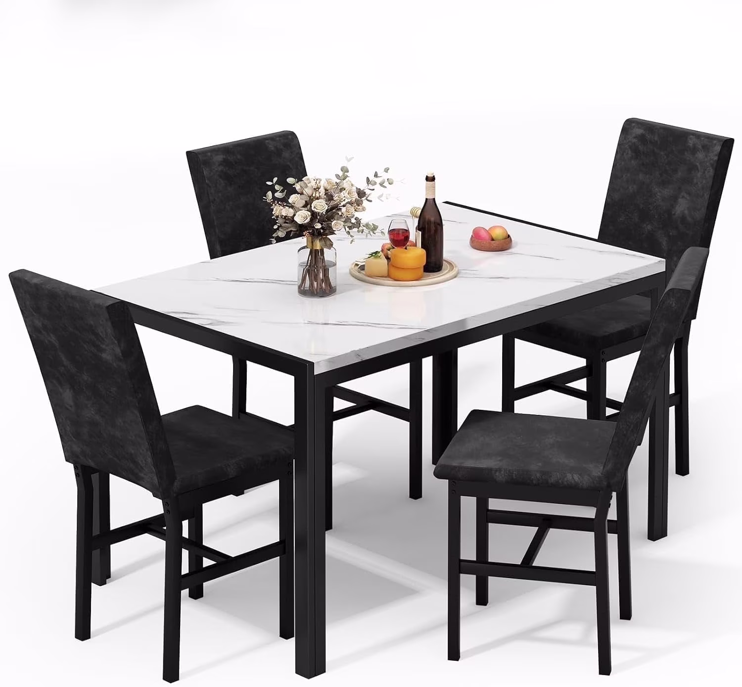 AWQM Products 5-Piece Marble Dining Set, Modern Kitchen Table and Chairs for Dining Room, Dinette, Compact Space Saving Furniture, 4 Upholstered Velvet Chairs - White