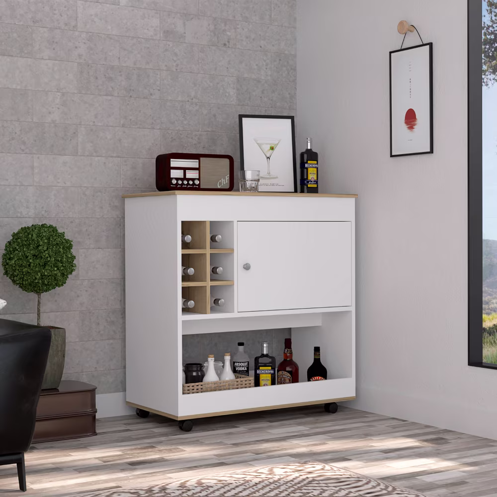 Dtwnek Bar Coffee Cart Cabinet with 4 Wheels, Kitchen Cart with 6 Bottles Storage and Shelf
