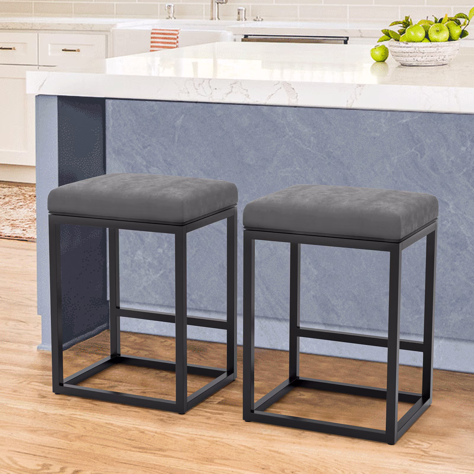 Nathaniel Home 24 Inch Bar Stools Set of 2, Modern PU Leather Metal Barstool, Backless Kitchen Dining Cafe Stool, Upholstered Bar Stool with Footrest, Gray