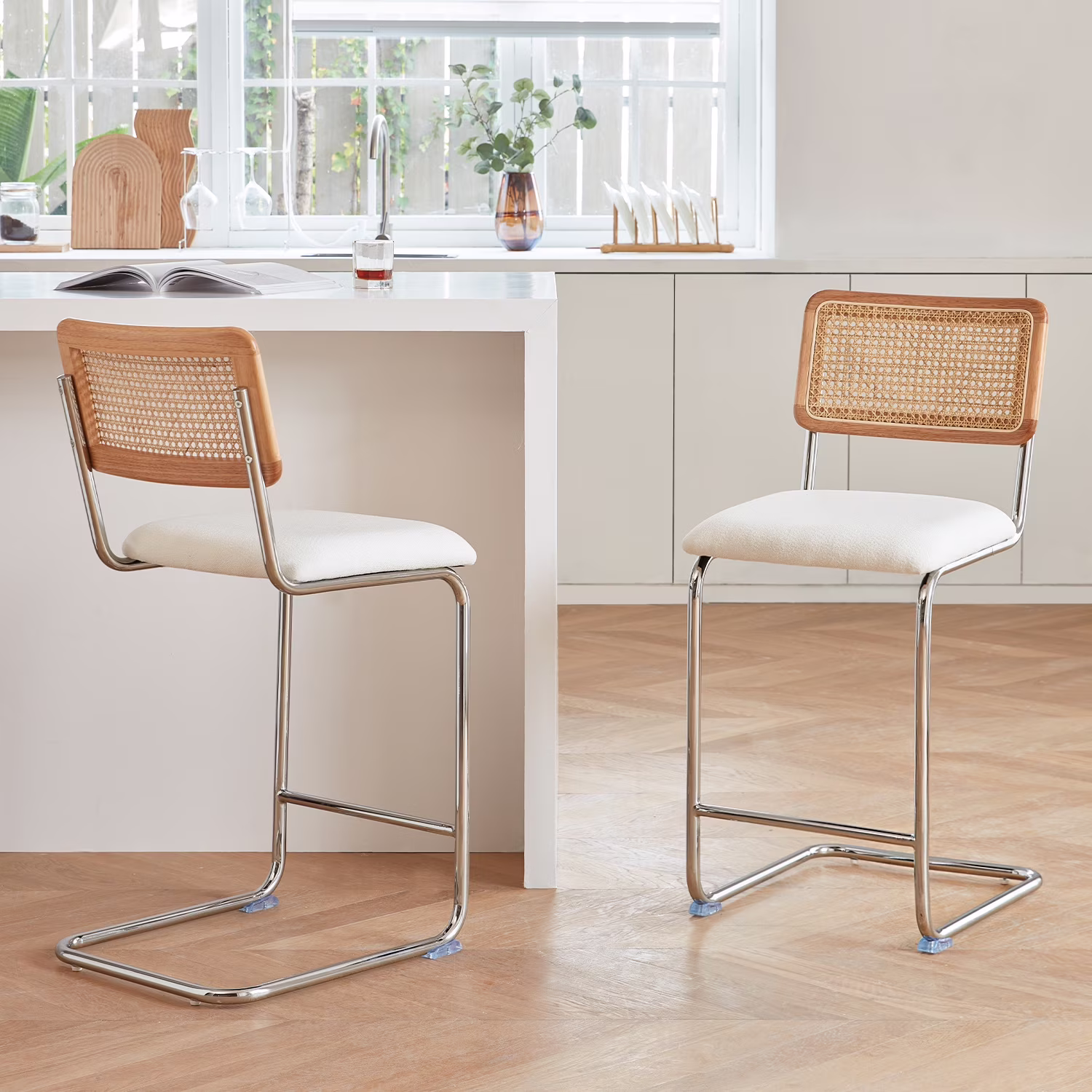 Natural Rattan Counter Height Stools Set of 2 with Solid Wood Back, 24 Inch Mid Century Modern Cesca Bar Stools, White Upholstery Boho Stool for Kitchen Counter with Chrome Metal Legs