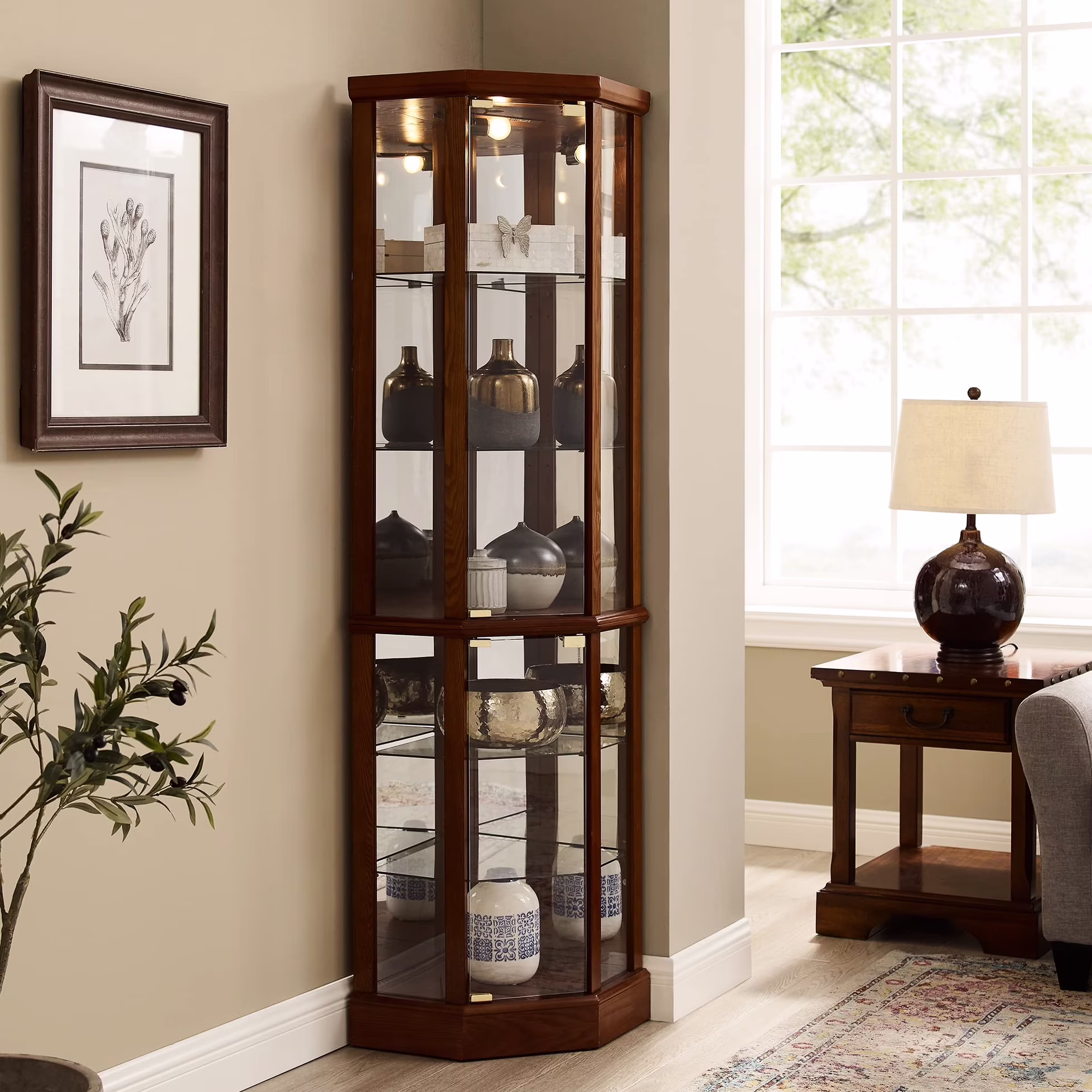Walnut Cabinet With 6 Shelves, Adjustable Glass & Mirrored Back Design Shelf Lighted Corner Curio Shelves In