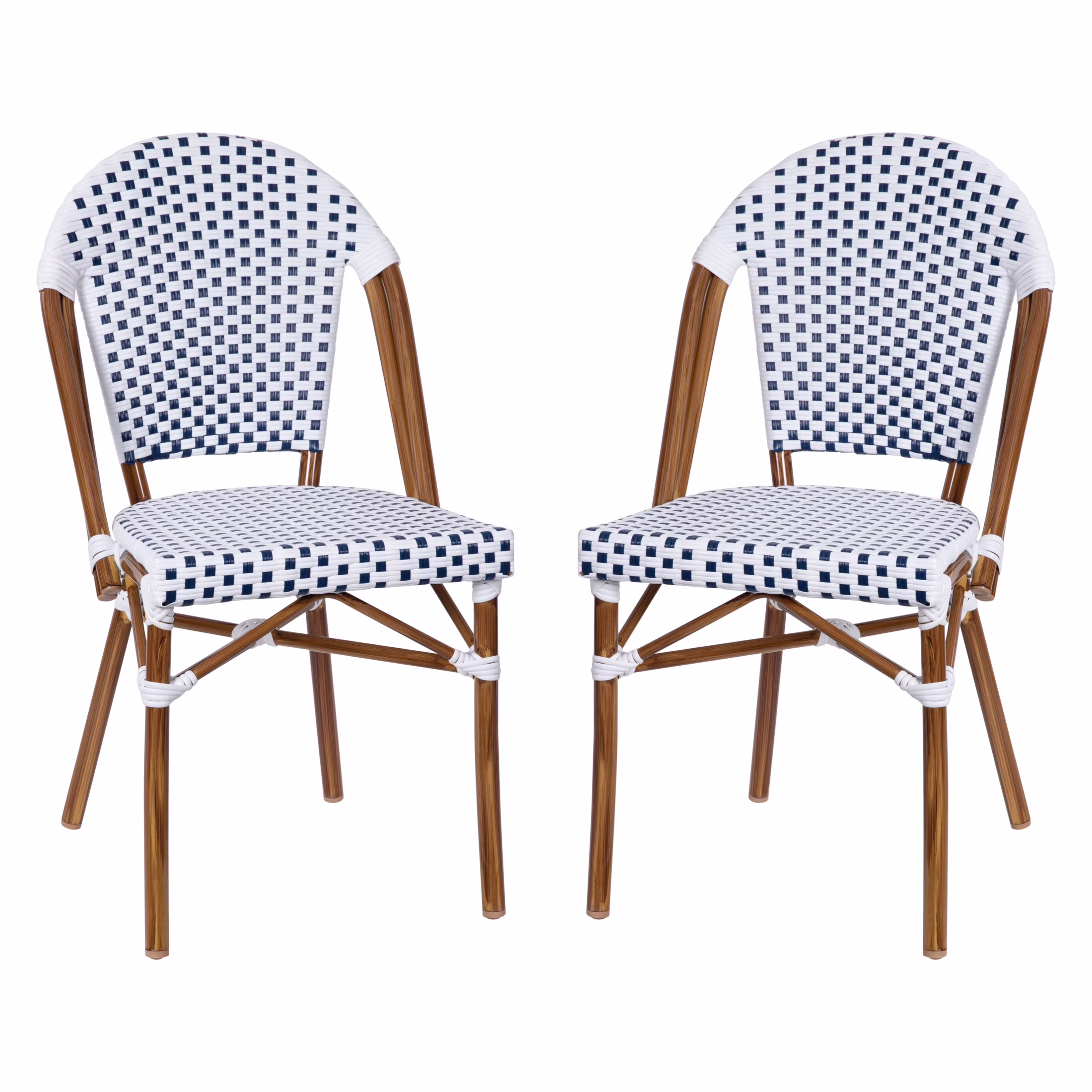 Flash Furniture Lourdes Set of 2 Indoor/Outdoor Commercial Bistro Stacking Chair, White/Navy PE Rattan Back and Seat, Bamboo Print Aluminum Frame in Natural