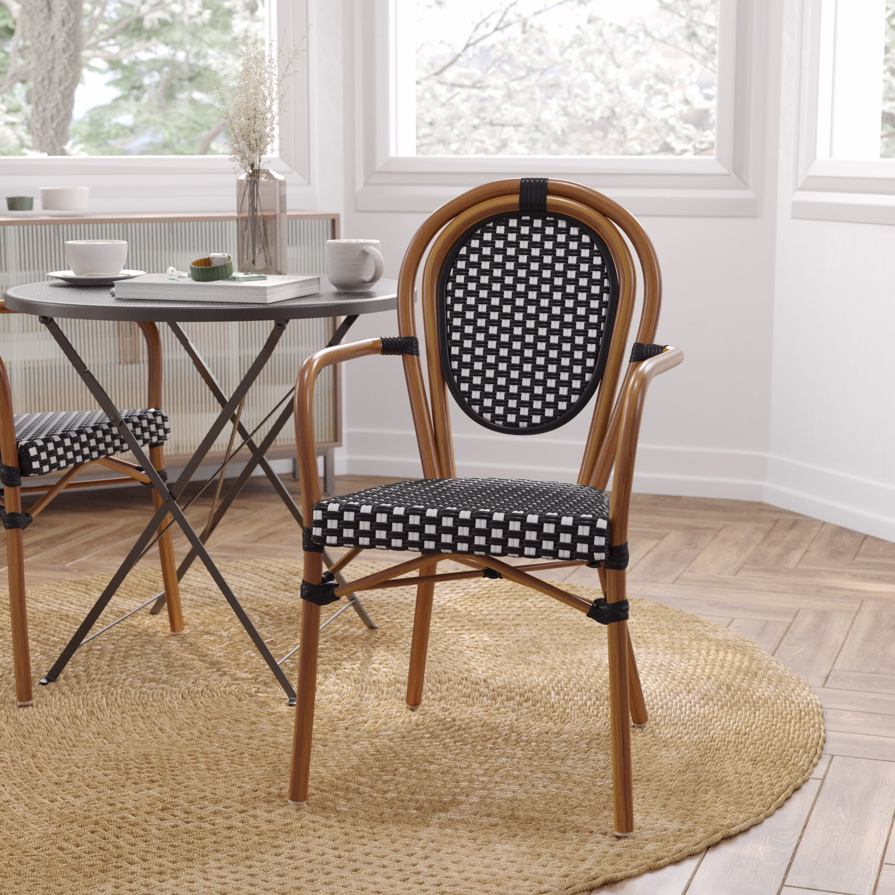 Merrick Lane Stacking Thonet French Bistro Style Chair with Arms, Black & White PE Rattan Seat, and Bamboo Finished Metal Frame for Indoor/Outdoor Use