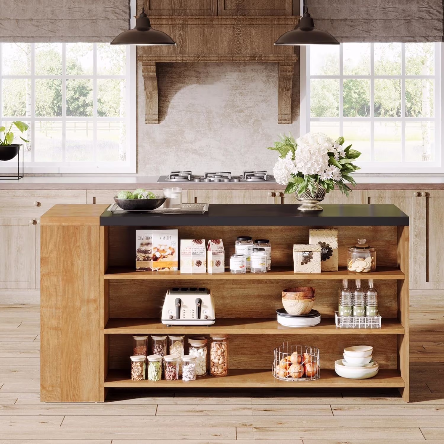 Tribesigns 55" Kitchen Island with Storage, Farmhouse 5-Tier Stationary Island Table, Wood Coffee Bar Tabl with Large Countertop for Kitchen