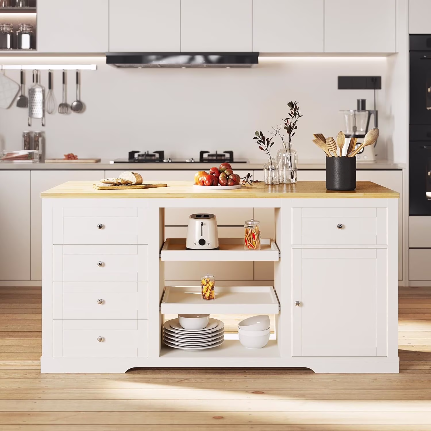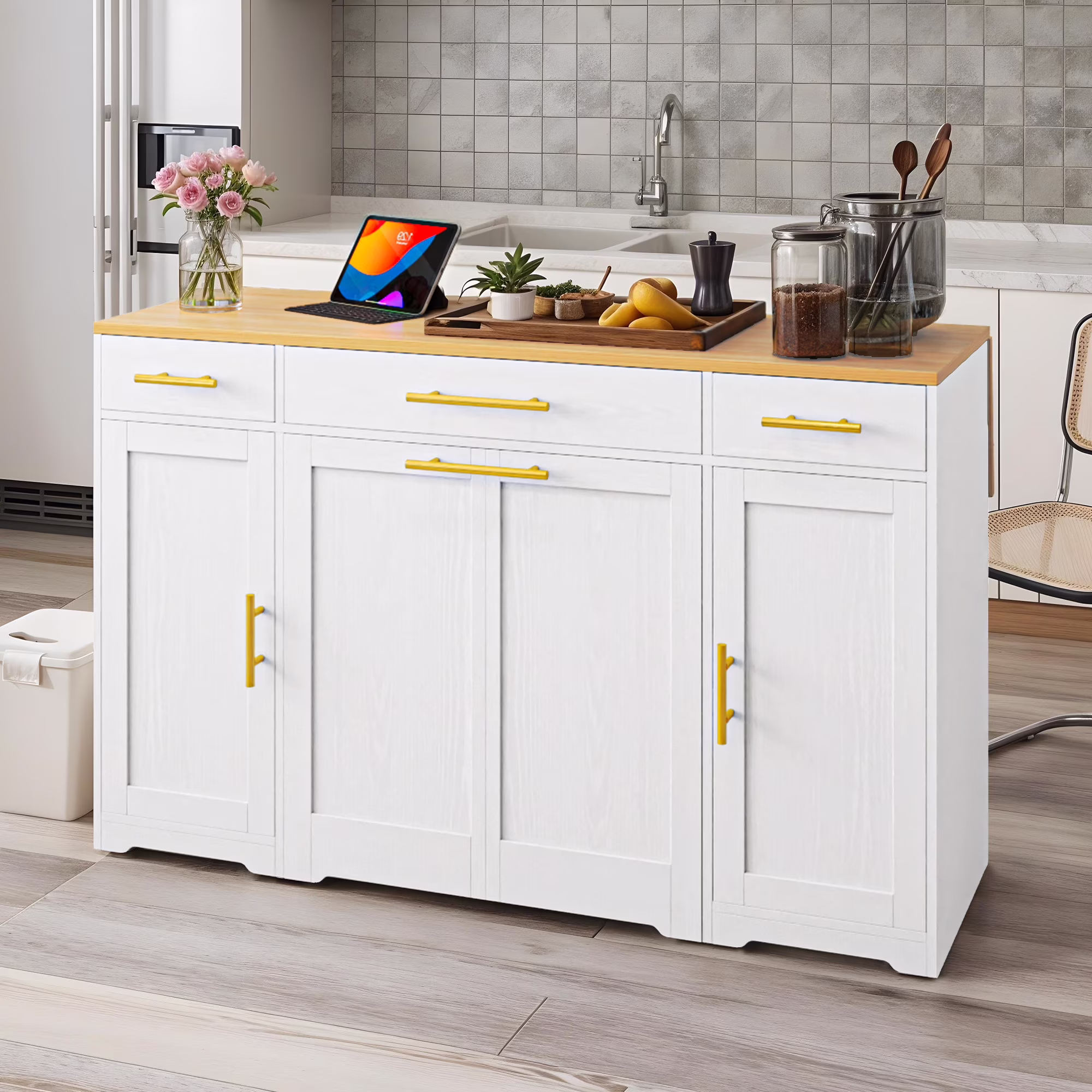 DEXTRUS Kitchen Island Table with Drawers & Doors, Storage Cart with Cabinet for Double 10-gal Trash Bin, White