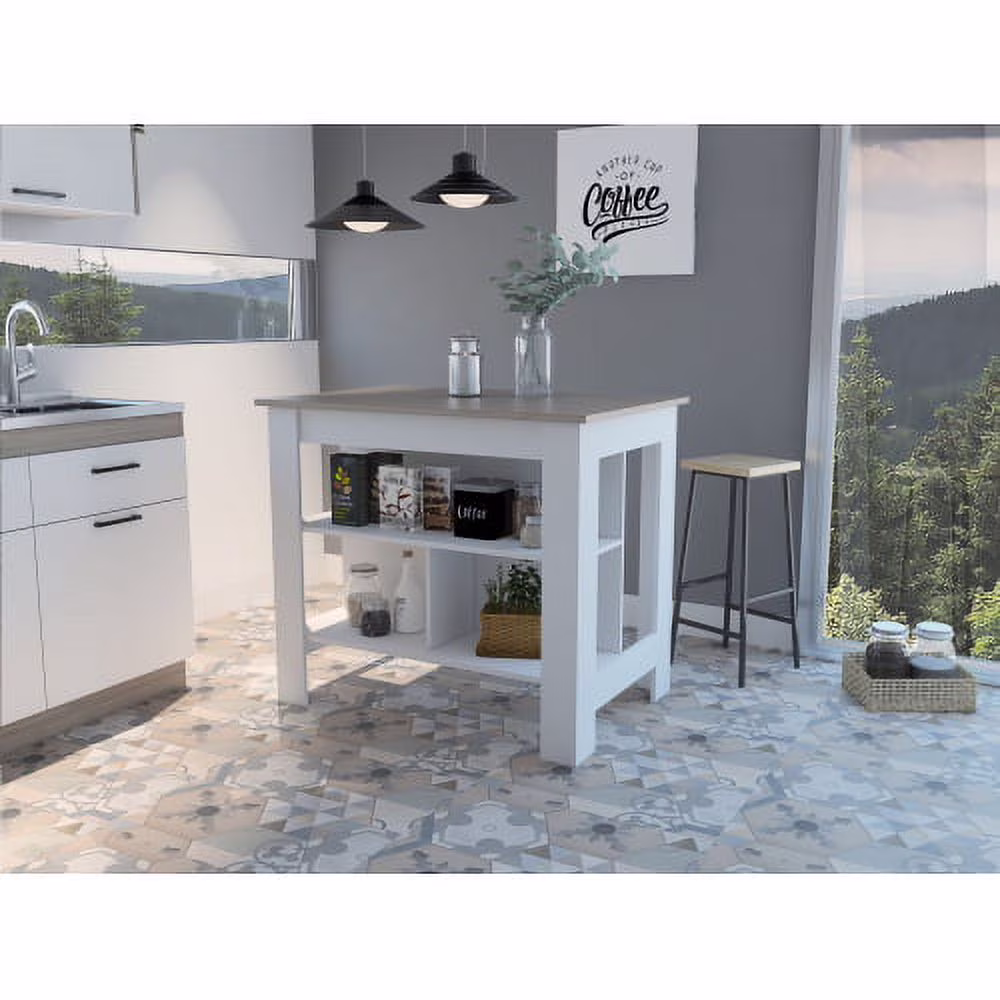 Cterwk Kitchen Island with 3 Open Shelves, Wood Top Kitchen Table for Dining Room, Light Gray + White