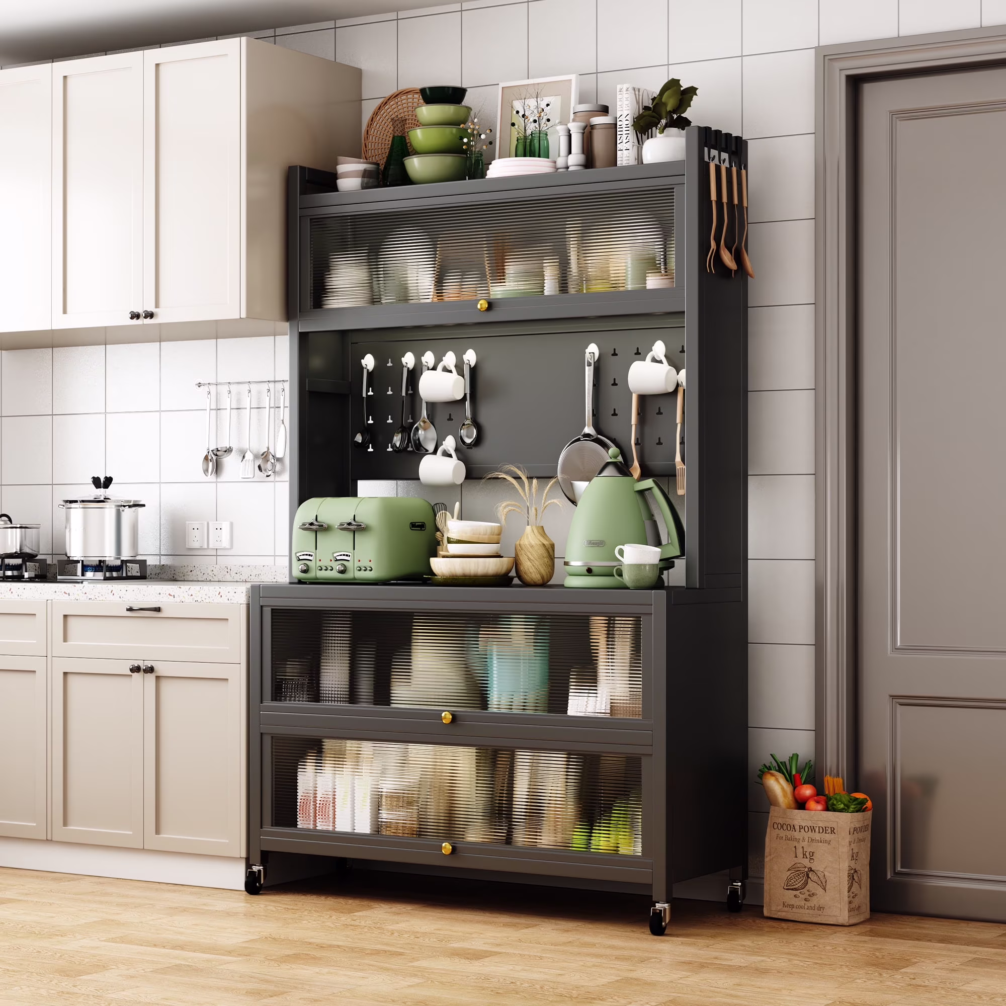 Montary 65" Kitchen Storage Rack - 5-Tier Microwave Stand w/Flip Door Cabinet & Coffee Bar (Gray)