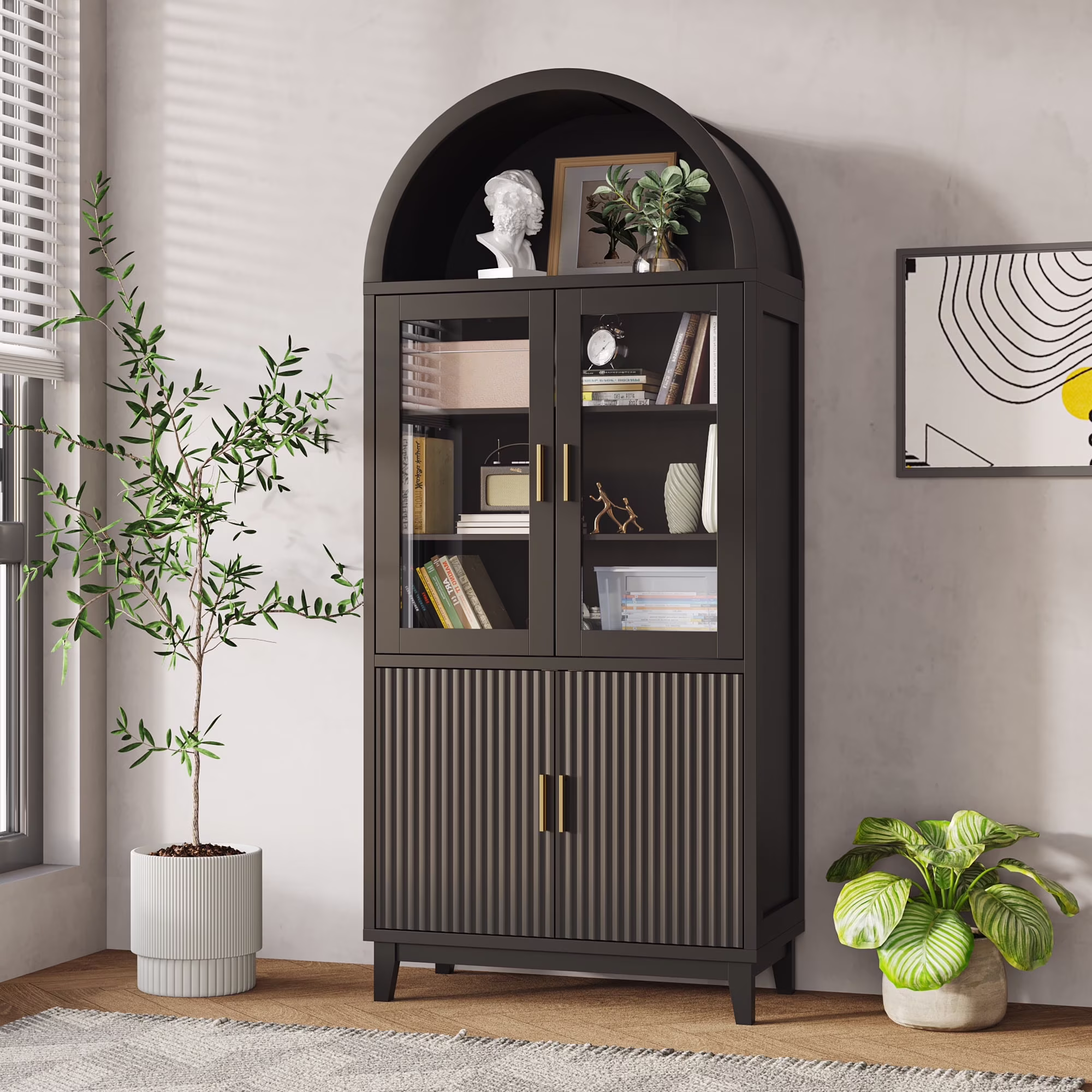 VEANERWOOD 71" Tall Arch Cabinet, Wood Fluted Kitchen Kitchen Storage Cabinet with 4 Doors and 6 Shelves for Dining Room Living Room