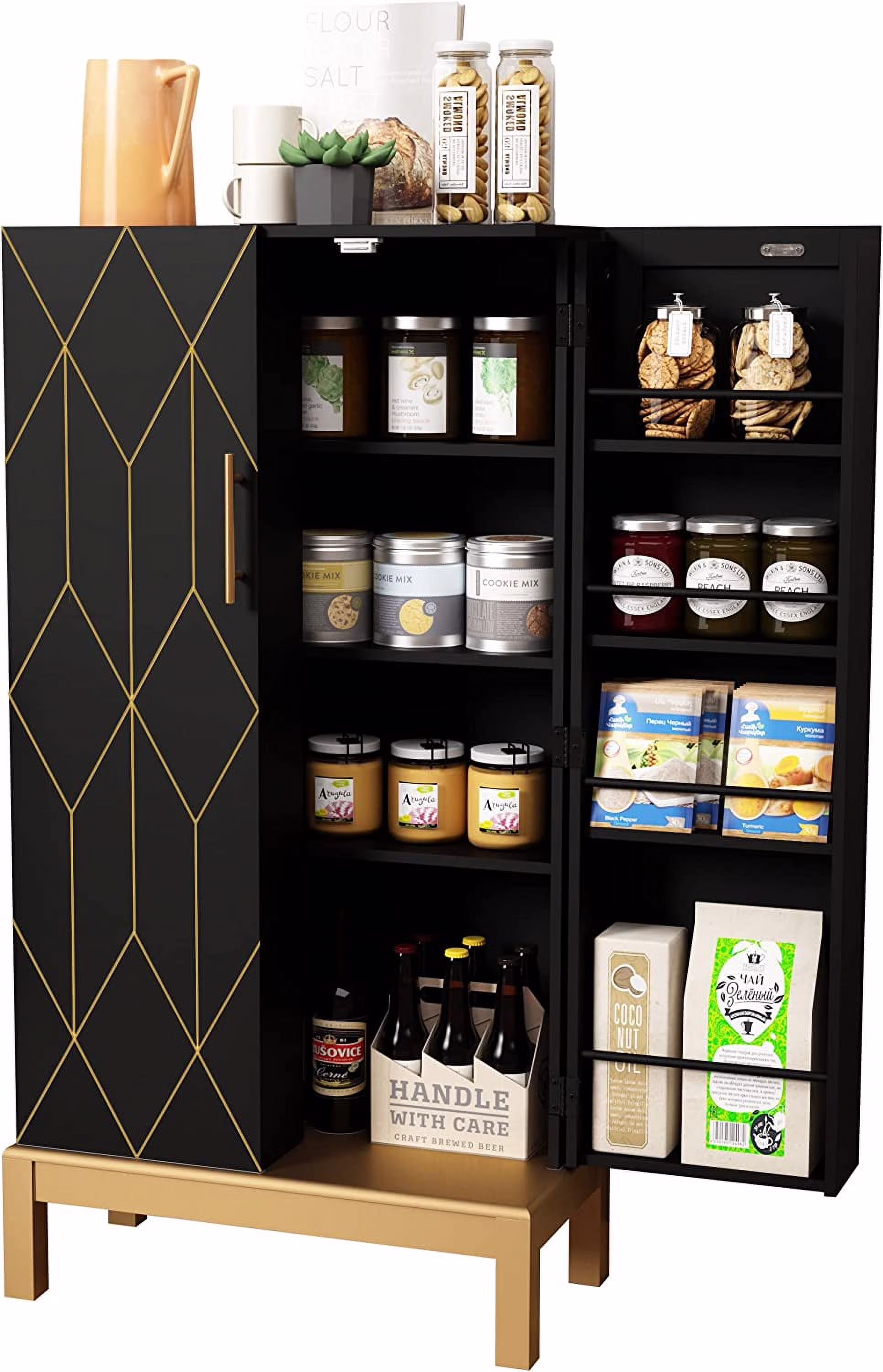 45'' Storage Cabinet with Doors and Adjustable Shelves,Food Pantry Cabinet for Kitchen, Dining Room,Living Room and Garage,Gold Lines and Legs,Pure Black Cabinet.