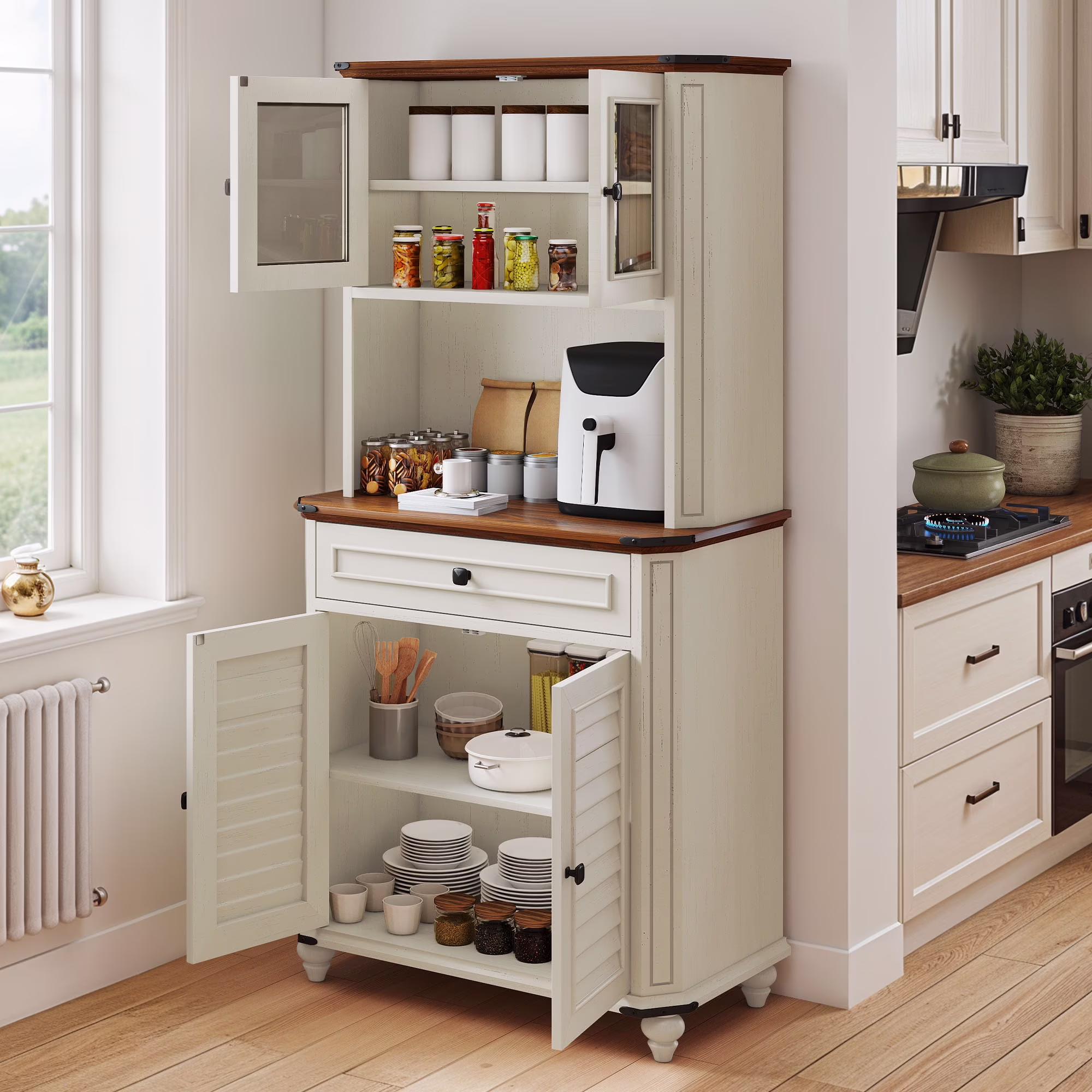 Uforic Kitchen Pantry Storage Cabinet with Microwave Stand & Drawer & Doors, White