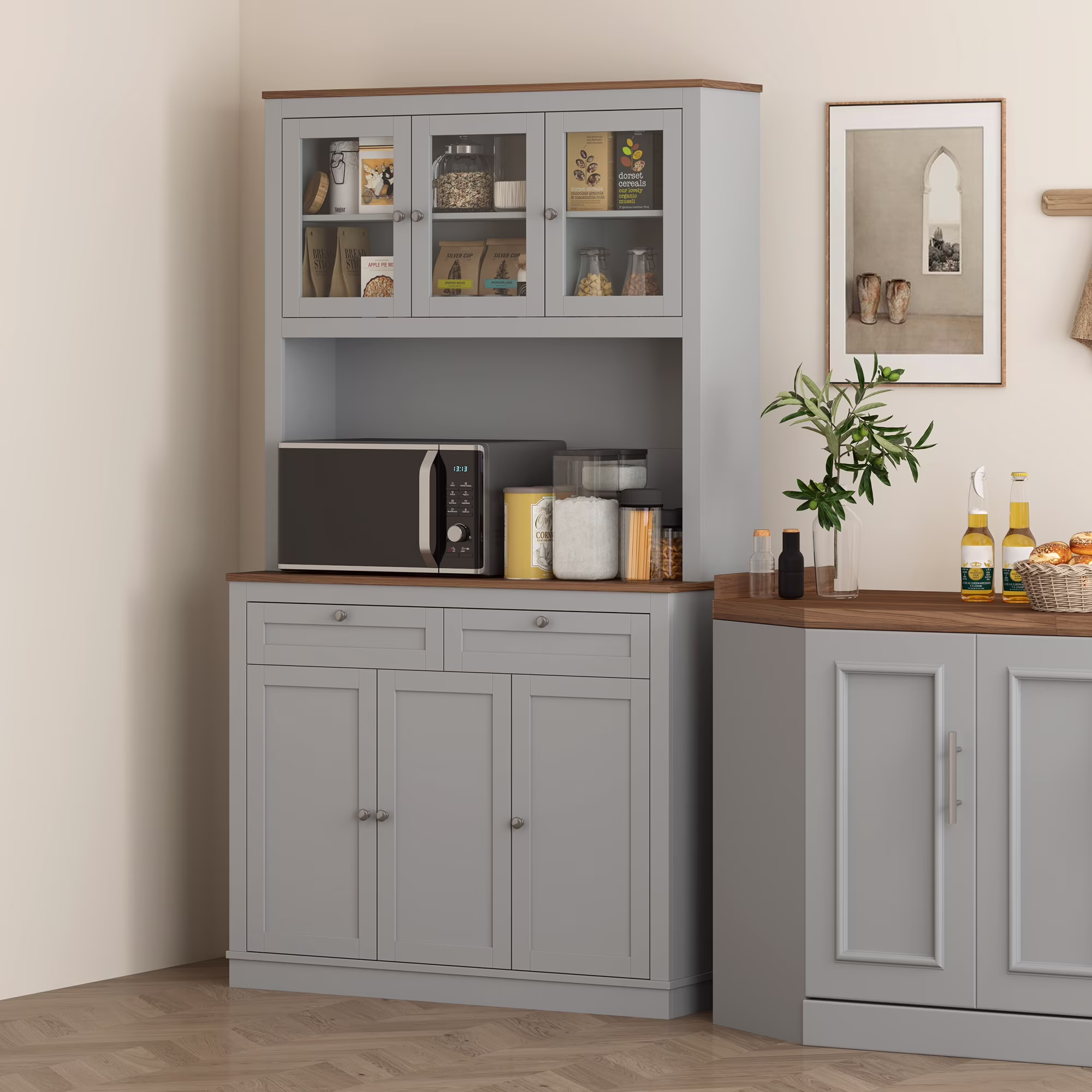 HOMCOM 71" Tall Kitchen Pantry Storage Cabinet with 2 Drawers, Microwave Cabinet with Adjustable Shelves and Glass Doors, Gray