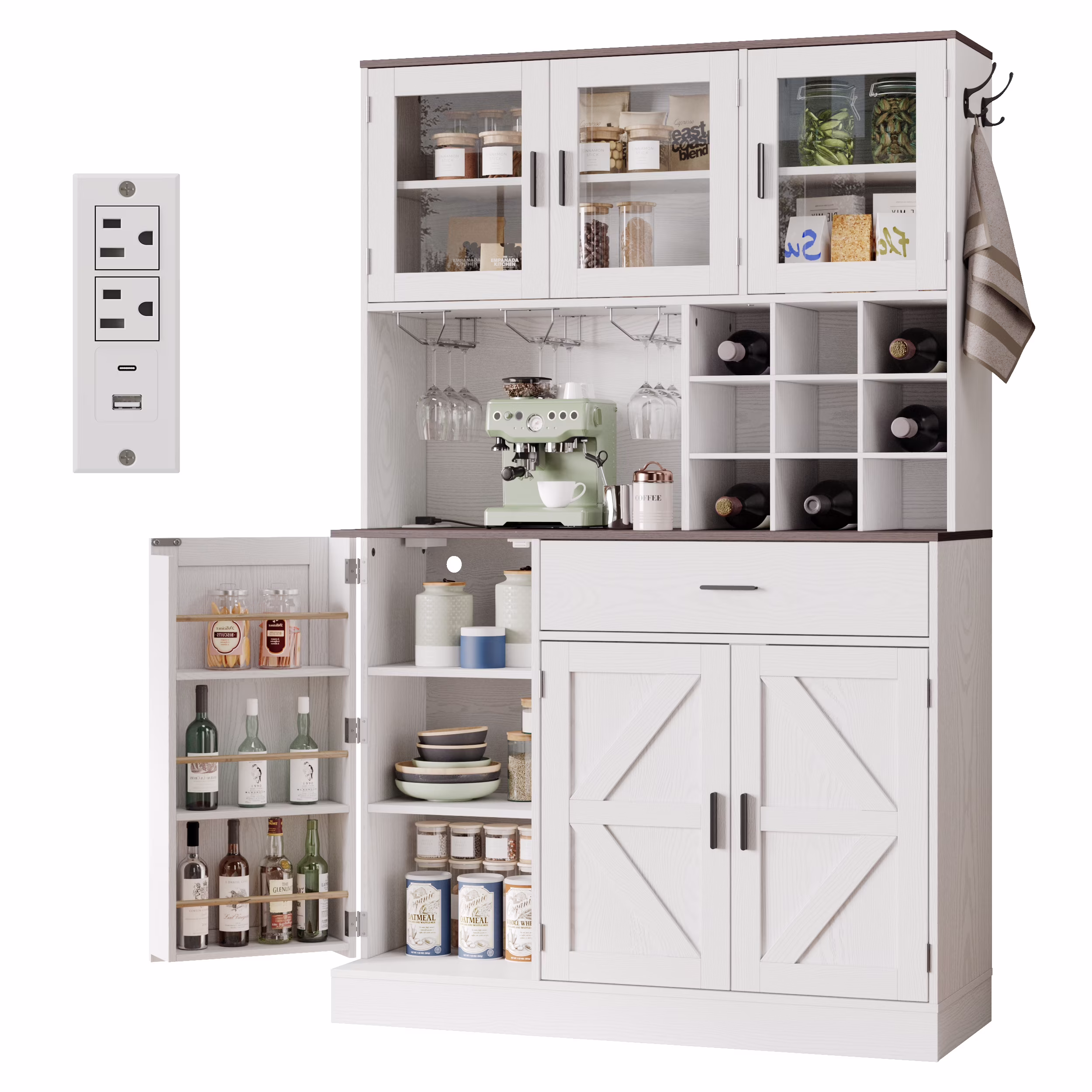 ANCTOR Kitchen Pantry Storage Cabinet with Glass Door, Kitchen Hutch Buffet Cabinet with Drawer, Power Outlet, Wine Rack