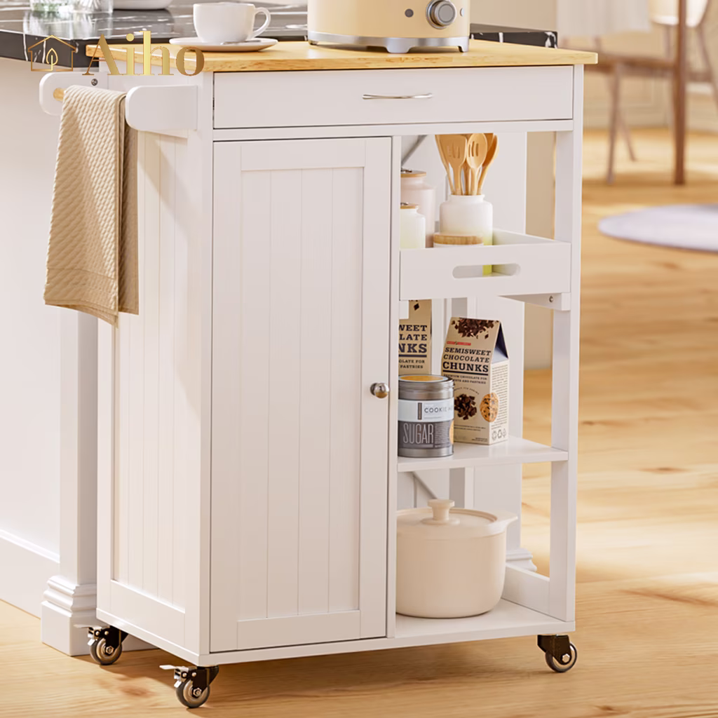 Aiho Kitchen Island Cart on Wheels with Towel Bar and Hooks, Rolling Mobile Serving Utility Cart with Drawer and Adjustable Shelves, White