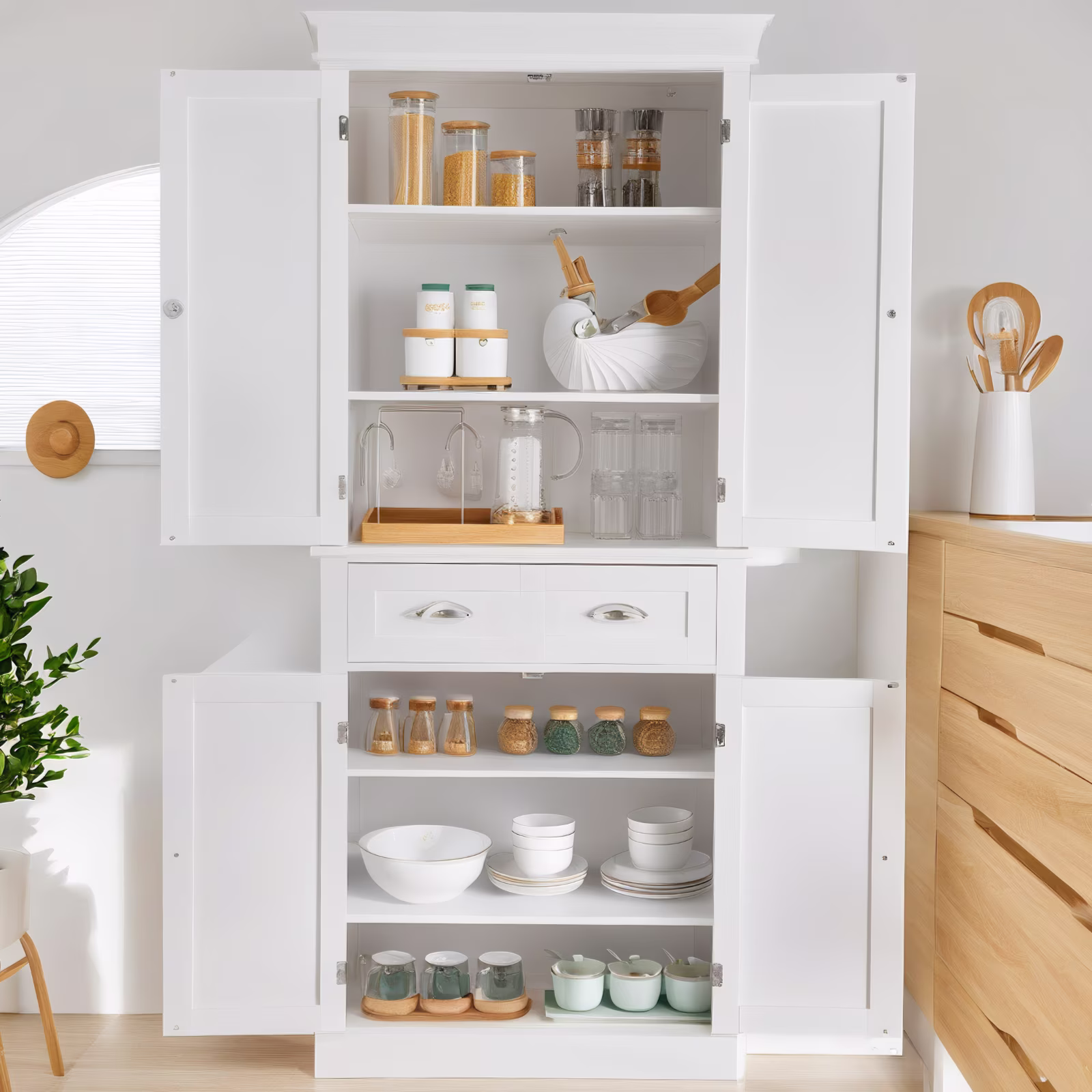 MAYEERTY Pantry Cabinet with 2 Doors – 3-Tier Freestanding Kitchen Storage Cupboard, Natural