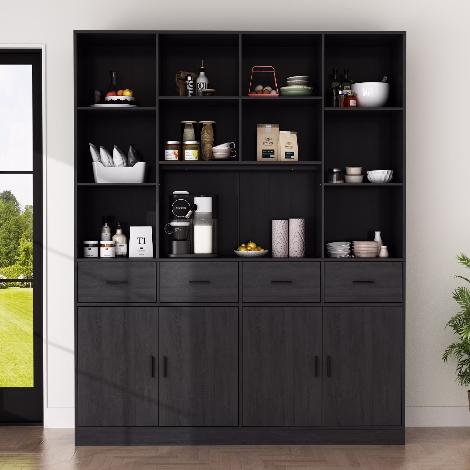 KULAGAGA Pantry Storage Cabinet with 4 Drawers & 4 Doors, Large Kitchen Pantry Cabinet with Shelves, Hutch Storage for Kitchen Living Room Hallway, Black