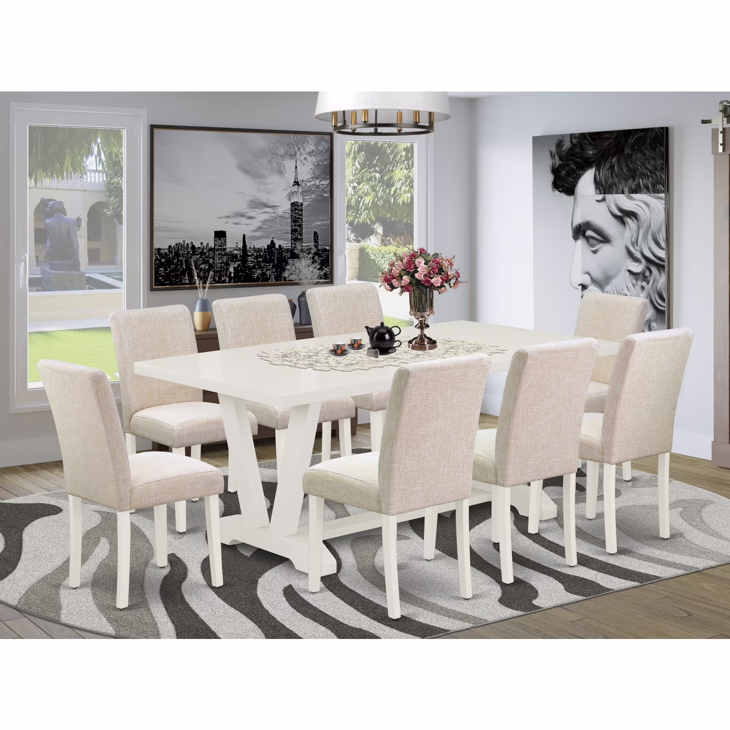 Maykoosh Suburban Soiree 9 Piece Room Set Includes a Rectangle Dining Table with V-Legs and 8 Light Beige Linen Fabric Upholstered Chairs, 40x72 Inch, V027AB202-9