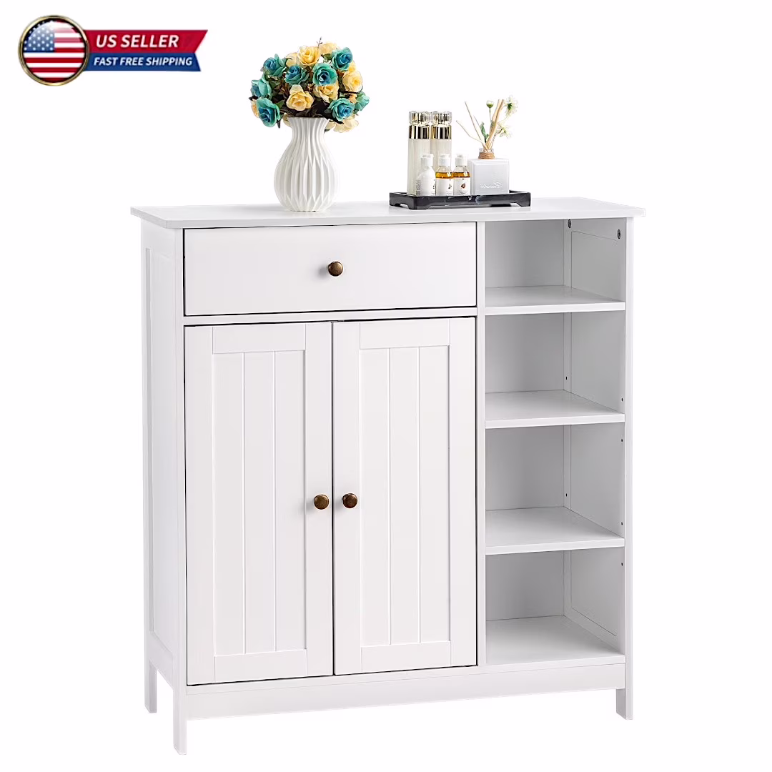 IVV White Storage Cabinet with Double Doors and Drawer, Floor Standing Kitchen Pantry Cupboard with Open Storage and Inner Adjustable Shelves for Entryway/Laundry/Bedroom/Living Room